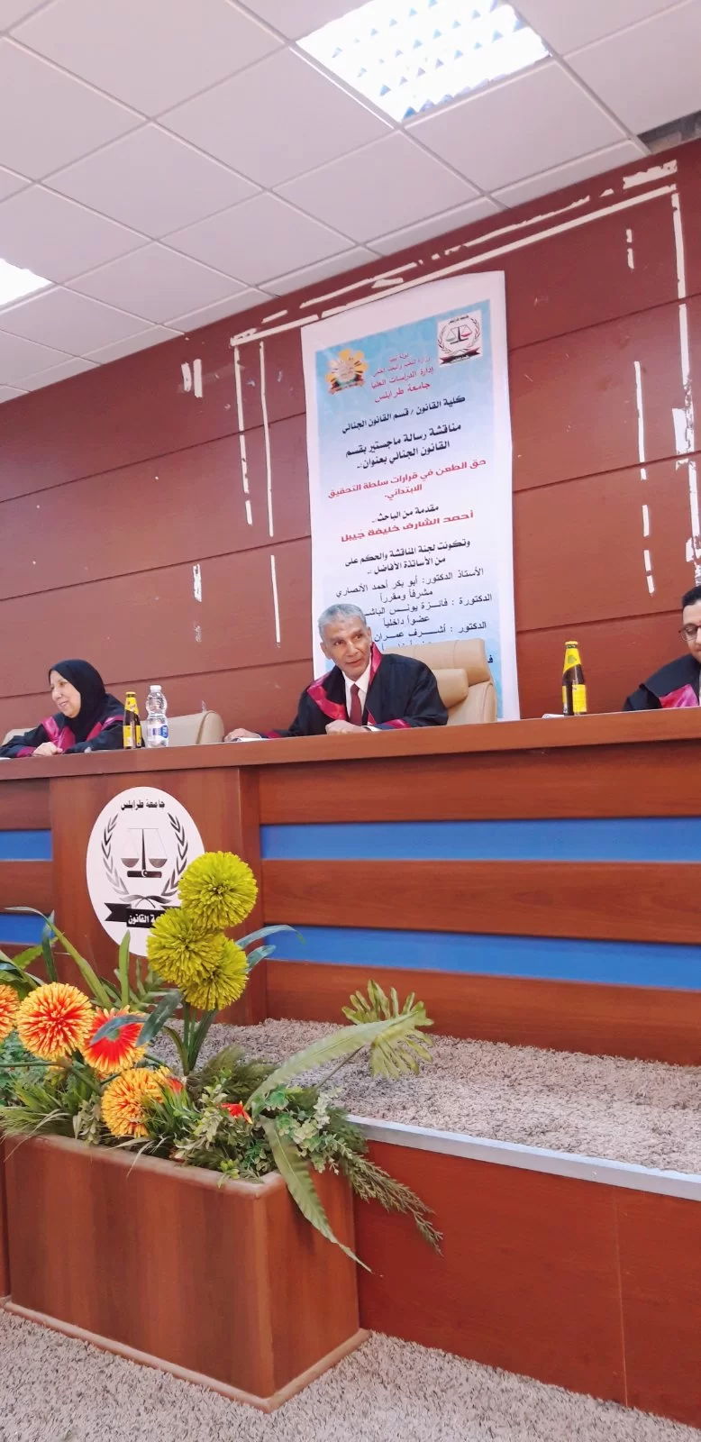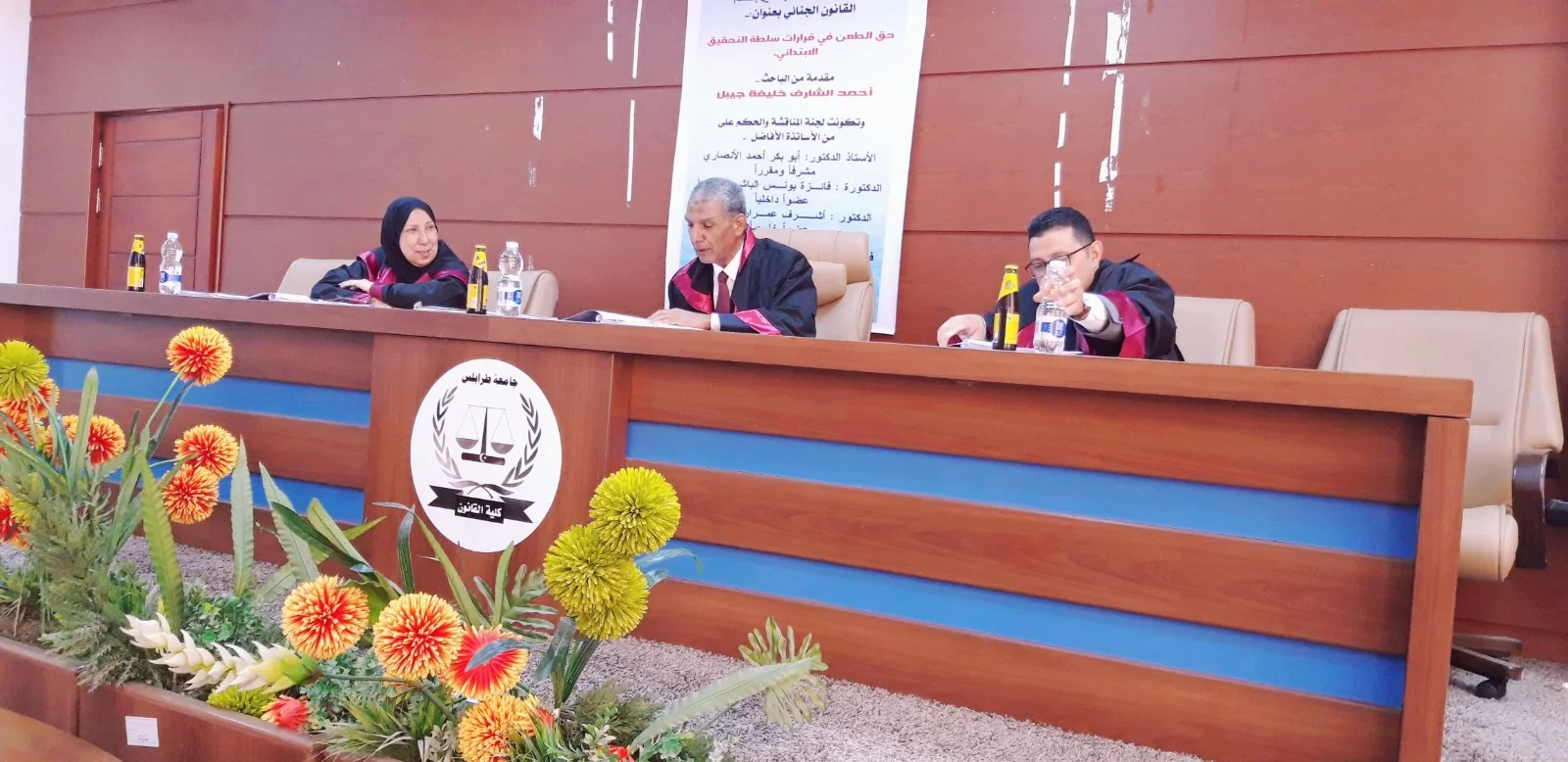 تم صباح اليوم مناقشة رسالة الاجازة العالية" الماجستير" المقدمة من المعيد بقسم القانون الجنائي أحمد الشارف خليفة، بعنوان "حق الطعن في قرارات سلطة التحقيق الابتدائي ".