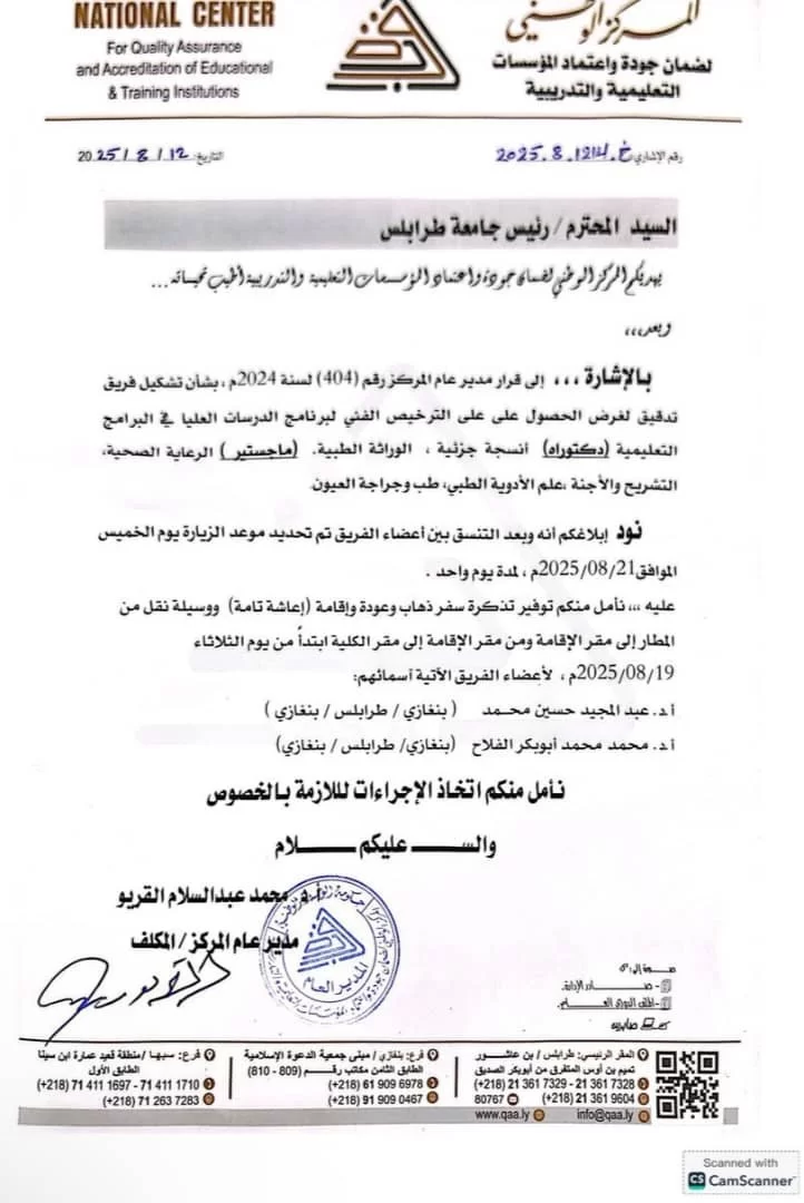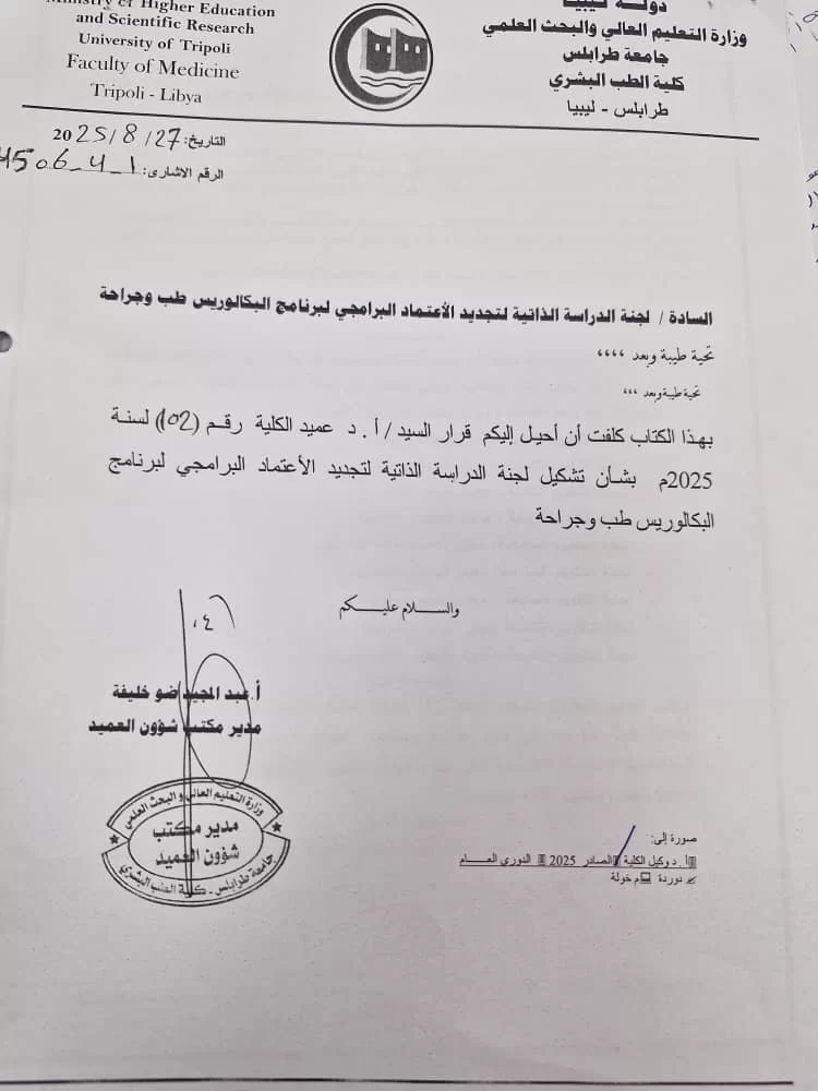 بناء على قرار أ.د عميد الكلية رقم ( 106 ) لسنة 2025م بشأن تشكيل لجنة لدراسة مدى استخدام البرامج والتقنيات الرقيمة في مجالات التعليم الطبي. اجتمع اعضــاء اللجنة يوم الأربعاء الموافق 24 سبتمبر 2025 على تمام الساعة 10 صباحاً بقاعة الاجتماعات بكلية الطب البشري جامعة طرابلس. افتتح رئيس اللجنة