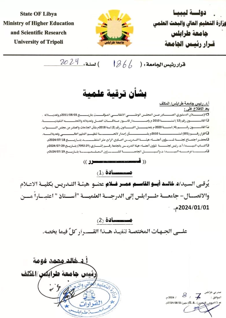 نتقدم بأحر التهاني والتبريكات للدكتور علي العماري سالم، عضو هيئة التدريس بقسم الإذاعة والتلفزيون، بمناسبة ترقيته إلى درجة أستاذ مشارك.الف مبارك وعقبال الاستاذية.
