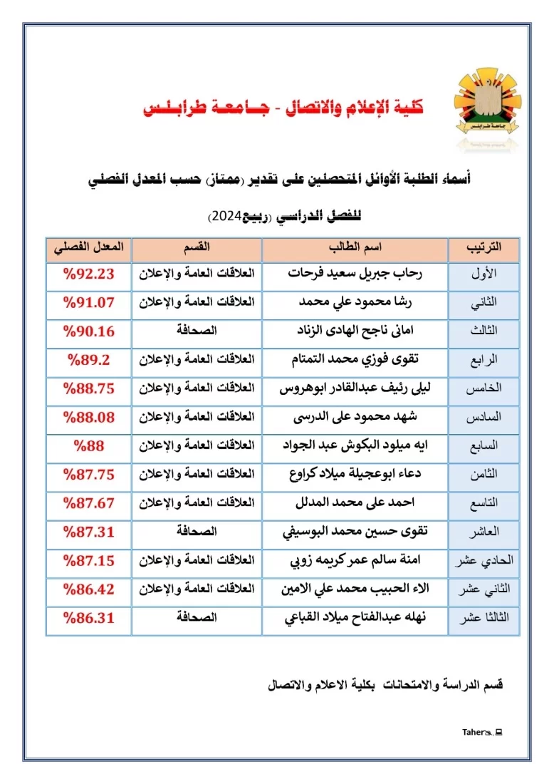 أوائل طلبة كلية الإعلام والاتصال للفصل الدراسي ربيع 2024