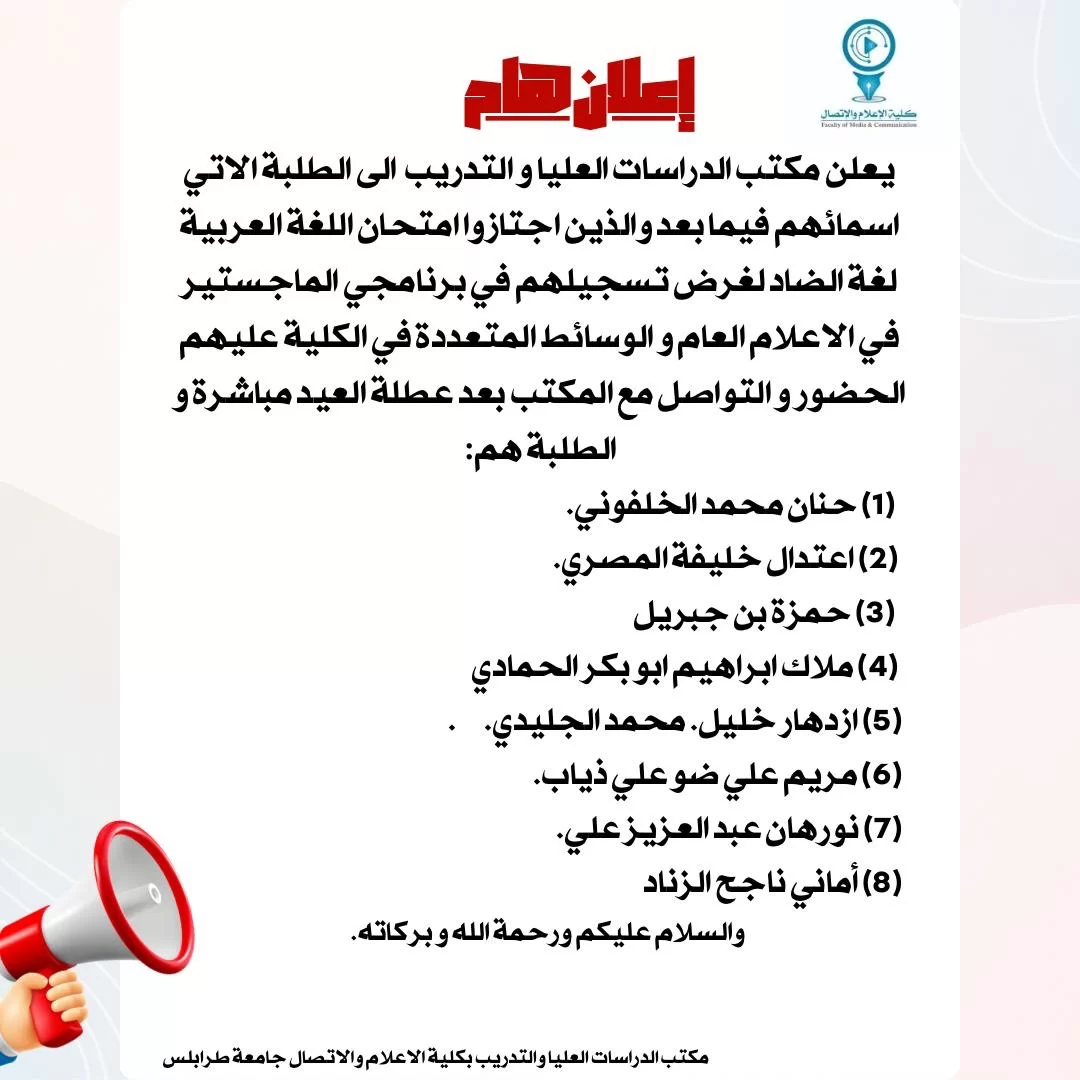 يعلن مكتب الدراسات العليا و التدريب بكلية الاعلام والاتصال بجامعة طرابلس الى الطلبة الاتي اسمائهم فيما بعد والذين اجتازوا امتحان اللغة العربية لغة الضاد لغرض تسجيلهم في برنامجي الماجستير في الاعلام العام و الوسائط المتعددة في الكلية عليهم الحضور و التواصل مع المكتب بعد عطلة العيد مباشرة و ا