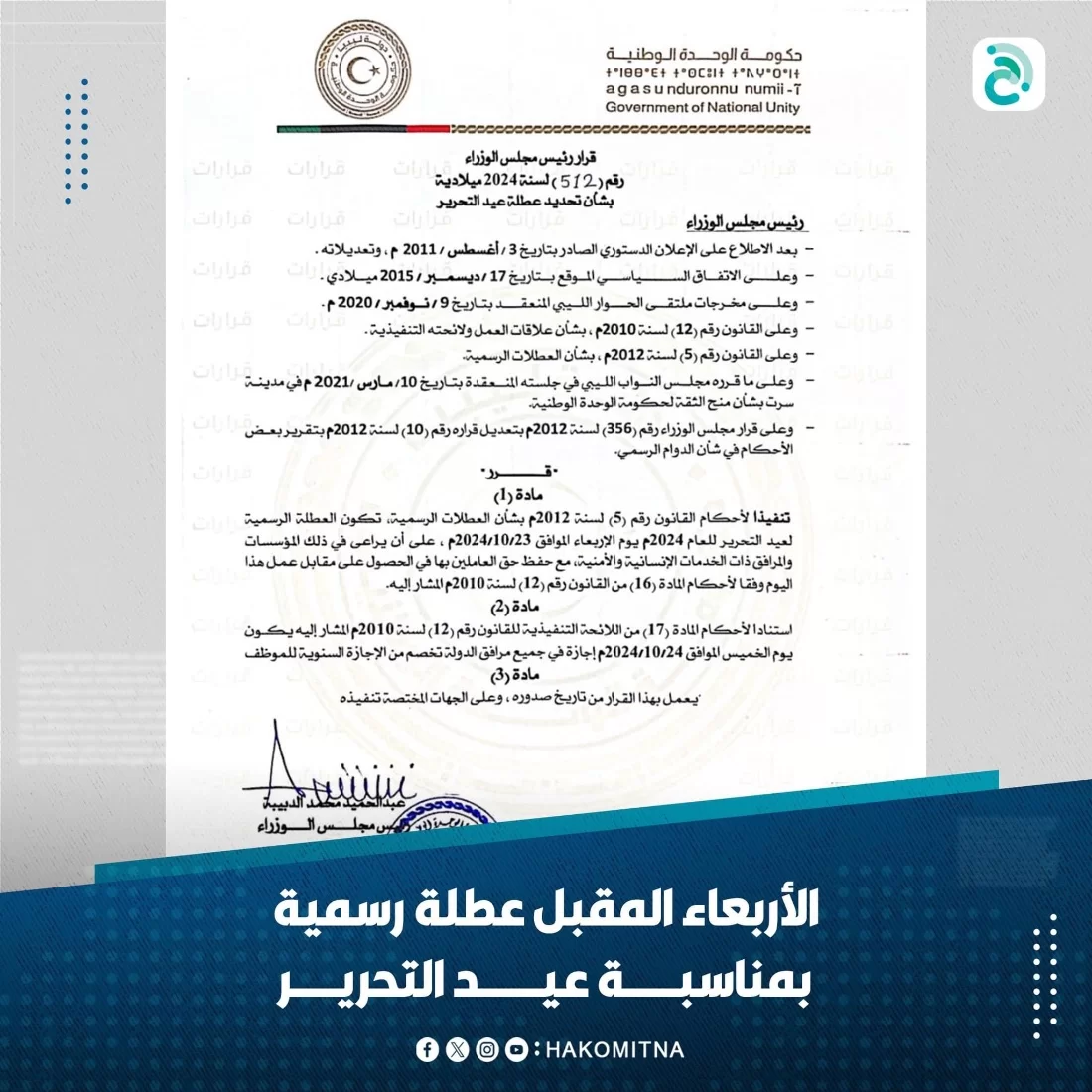 بمناسبة ذكرى عيد التحرير.. رئيس الوزراء عبدالحميد_الدبيبة، يصدر القرار 512، يحدد بنصه الأربعاء المقبل عطلة رسمية، والخميس إجازة تخصم من رصيد الإجازات السنوية لموظفي المؤسسات والمرافق العامة، على أن يراعى في ذلك المؤسسات والمرافق ذات الخدمات الإنسانية.منصة حكومتنا