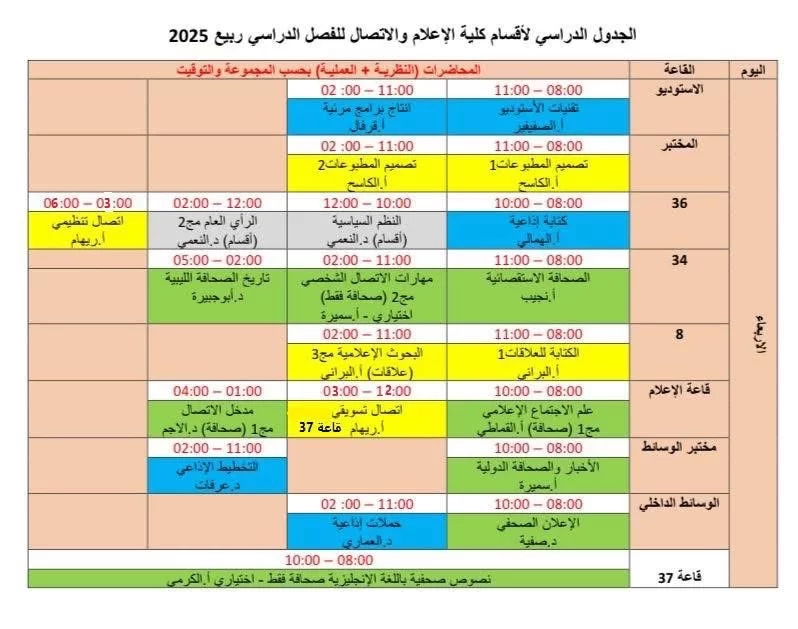 جدول المقررات الدراسية لأقسام الكلية الفصل الدراسي ربيع 2025م