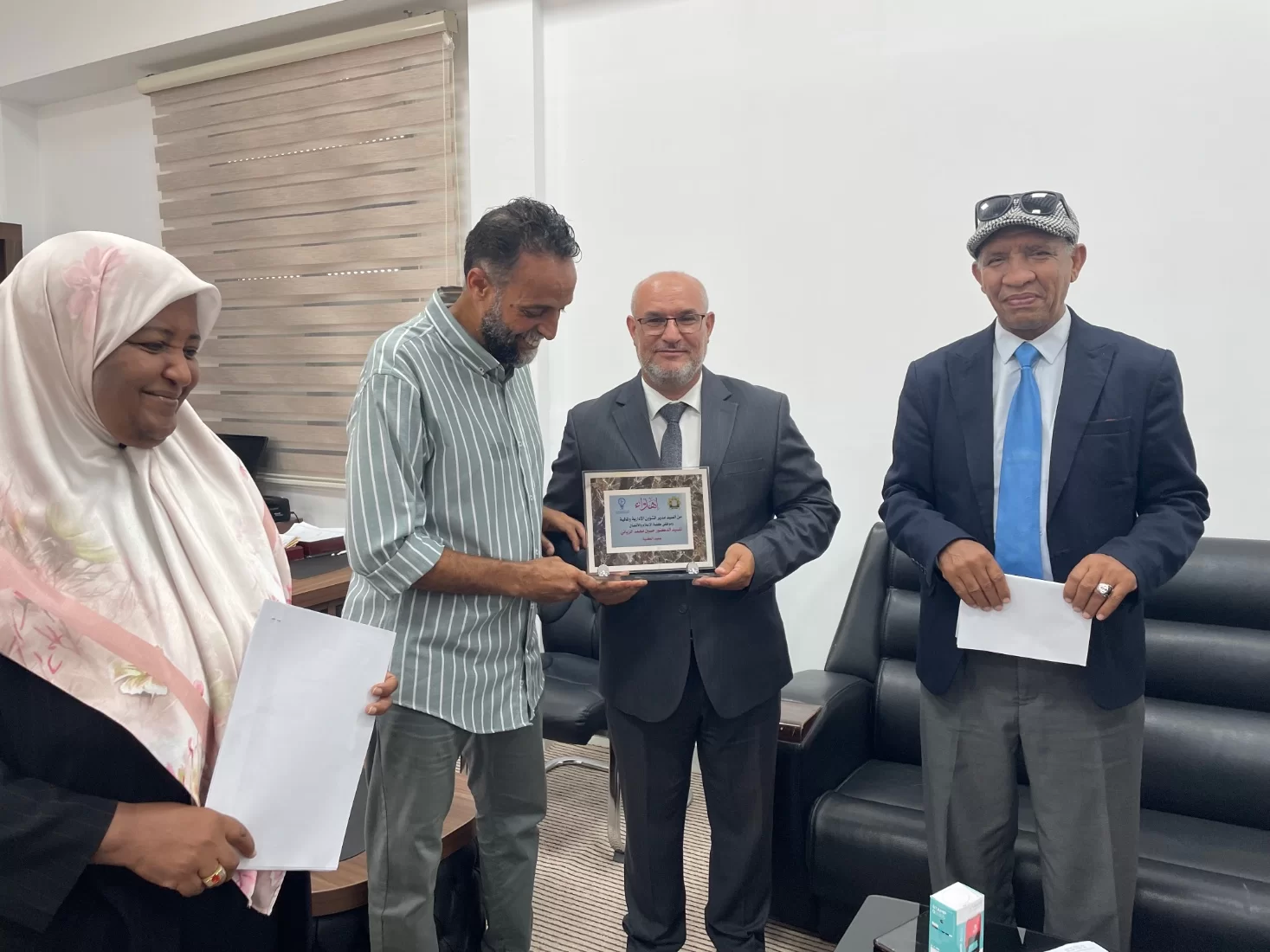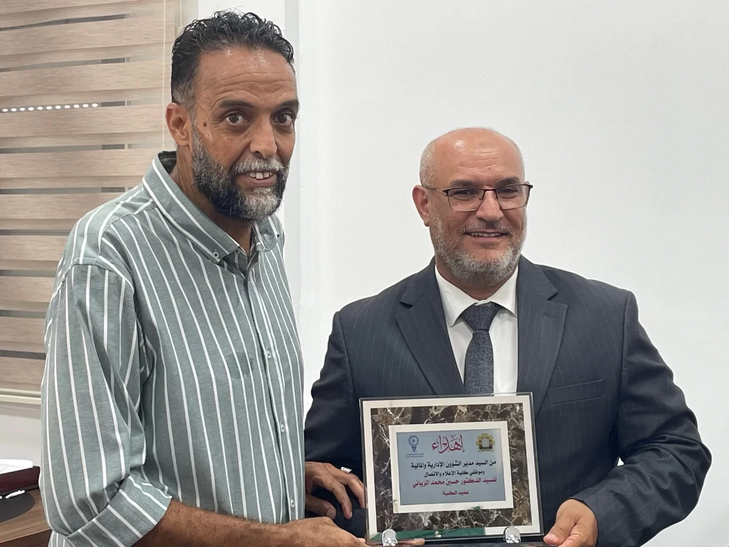 وفي ختام المراسم، قدّم مدير الشؤون الإدارية والمالية بالكلية، الأستاذ عبدالسلام عشيش، درعًا تذكاريًا باسم موظفي الكلية إلى الدكتور حسين، عرفانًا وتقديرًا لجهوده، متمنين له دوام الصحة والتوفيق.