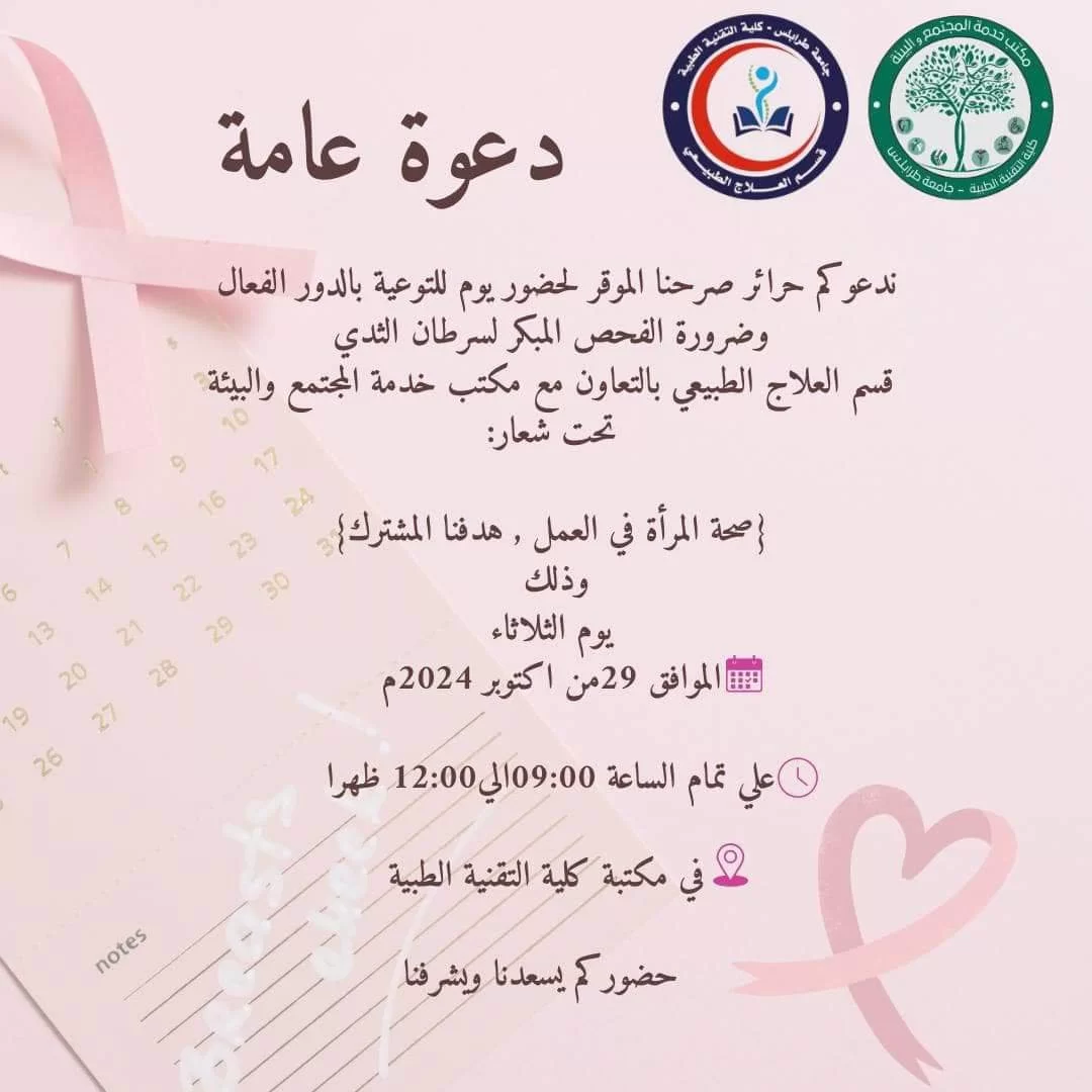 دعوة عامة ضمن إطار النشاطات المقامة داخل اسوار جامعة طرابلس بمناسبة مايعرف بالشهر الوردي ((الحملة الوطنية للتوعية بسرطان الثدي )). وتنفيد لخطة مكتب خدمة المجتمع والبيئة بالكلية لاحياء الايام العالمية يعتزم قسم العلاج الطبيعي علي دعوتكم بالمشاركة و