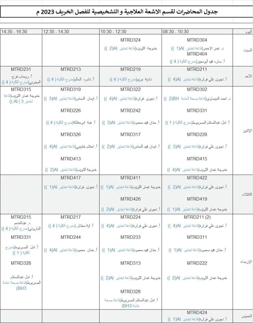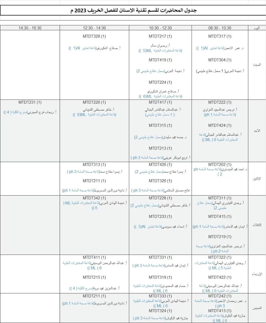 على جميع الطلبة أخذ العلم بأن البدء الفعلي في المحاضرات الدراسية للفصل الدراسي الخريف/ 2023م، إبتداء من يوم الغذ السبت الموافق 2023/12/16م،علـــيه نأمل منكم الاطلاع على الجداول الدراسية المرفقه لمعرفة الأماكن المخصصة للمحاضرات، أما بخصوص الطلبة الذين قاموا بتسليم نماذج التنزيل يدويا، نأمل منكم الالتزام أيضا بالمحاضرات التي تم تسجيلها في النموذج، حيث تم إدراج عدد كبير من الطلبات، ولم يتبق إلا القليل، وسيتم الانتهاء منهم في نهاية دوام يوم الاثنين القادم، متمنين لكم التوفيق دائما.