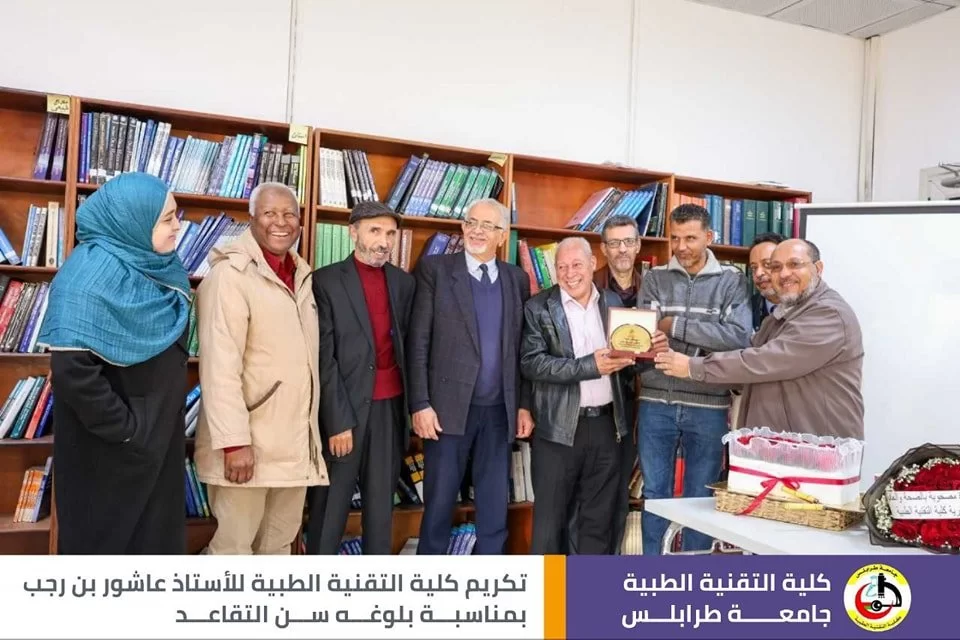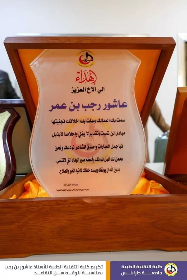 قال رسول الله صلَّ الله عليه وسَلَّم : (مَنْ صَنَعَ إِلَيْكُمْ مَعْرُوفًا فَكَافِئُوهُ، فَإِنْ لَمْ تَجِدُوا مَا تُكَافِئُونَهُ فَادْعُوا لَهُ حَتَّى تَرَوْا أَنَّكُمْ قَدْ كَافَأْتُمُوهُ). في أجواء تسودها المحبة والمودة أقامت كلية التقنية الطبية اليوم وبحضور عدد من الموظّفين وأساتذة الكلية حفل تقاعد وتكريم للموظف المميز في كلية التقنية الطبية أ. عاشور عمر بن رجب، وتخلّلَ الاحتفاليَّة كلمات ثناءٍ وإشادةٍ بالجهود التي قدمها طيلة فترة عمله في الكلية، نتمنى له موفور الصحة والعافية، وبارك الله فيه على جميع ما قدمه، متمنين له دوامَ التَّوفيق وحياة مملؤة بالعطاءِ والصَّحةِ.