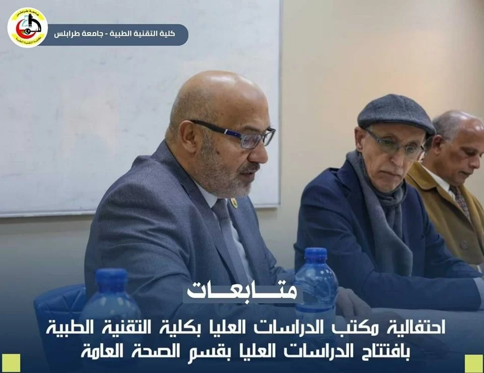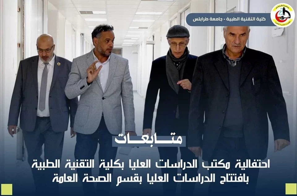 تَمَّ بحَمْدِ الله افتتاح برنامج الدراسات العليا بقسم الصحة العامة "ماجستير" التغذية العلاجية. وقد كان البرنامج لهذا اليوم كالتالي: • كلمة لمدير مكتب الدراسات العليا بالكلية أ.د. بدرالدين النجار . • كلمة لرئيس الجامعة أ.د. خالد عون . • كلمة لمدير إدارة الدراسات العليا بالجامعة د.محمد أبو رواي. • كلمة لرئيس قسم الصحة العامة د.أمل الصربوط، وقد ألقت رئيس القسم كلمة ترحيب بالحضور، وتقديم الشُّكر لِكُل من ساهم في إعداد ملف الدراسات العليا بالقسم :• أ.د. جمال الخوجة. • د. أريج عبدالجواد. • د. منال الخالقي. • د. نجية الوسيع، وتَّم تقديم الشُّكر -أيضا- لإدارة الكلية لما قدَّمته من مَد يد العون والمساعدة للقسم. نسأل الله التَّوفِيق والسَّداد للجميع والنَّجاح للقسم في هذا البرنامج، وَكَافَّة البرامج التي يسعى القسم لإدراجها من ضمن برامج الدراسات العليا بالقسم (ماجستير التثقيف الصحي، ماجستير مكافحة العدوى). وتمنيَّاتِنا بمزيد من التَّطوِير من أجل الرَّفع من المستوى التًّعليمي للكُلِيَّة . "كُل الشُّكْر والتَّقْدِير لَكٌم"