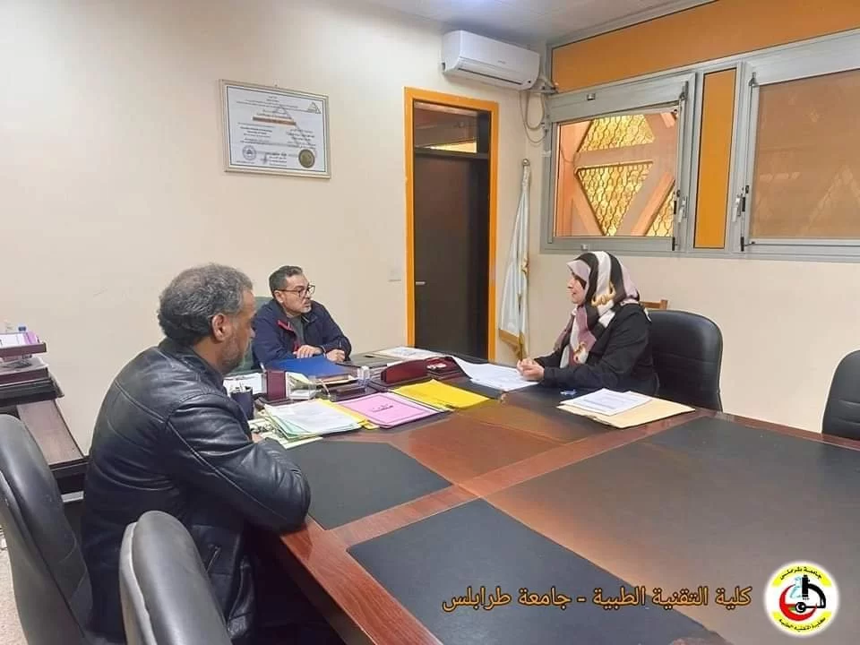 في إطار عمل وسعي كُليَّة التَّقنِيَّة الطَّبِّيَّة للحصول على الاعتماد البرامجي، عقد اليوم الاثنين الموافق 12/02/2024 عميد كُليَّة التَّقنِيَّة الطَّبِّيَّة السَّيد د.جمعة بن سليمان اجتماعا ضمِّ كُّلا من : رئيس قسم الجودة وتقييم الأداء بالكلية والسَّيِّدة د. أحلام الخشيبي ومدير الشؤون الإداريَّة والماليَّة للكليَّة السَّيَّد أ. عبد الله خلف الله، وقد خُصَّصَ الاجتماع لمناقشة التَّجهيزات لتقديم ملف الاعتماد البرامجي لكليَّة التَّقنِيَّة الطِّبِّيَّة إلى مركز ضمان الجودة خلال الأيَّام القادمة.