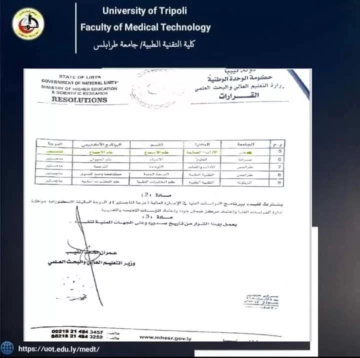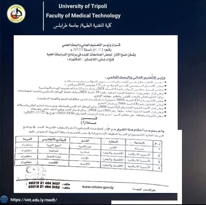 ويُعد افتتاح برنامج الدراسات العليا (الماجستير) في تخصص مكافحة العدوى – قسم الصحة العامة، المعتمد استنادًا إلى قرار وزير التعليم العالي والبحث العلمي رقم (1581) الصادر بتاريخ الإثنين الموافق 19 يناير 2026م، إضافة مهمة تعكس حرص الكلية على مواكبة متطلبات القطاع الصحي، وتعزيز البحث العلمي، والمساهمة في خدمة المجتمع .