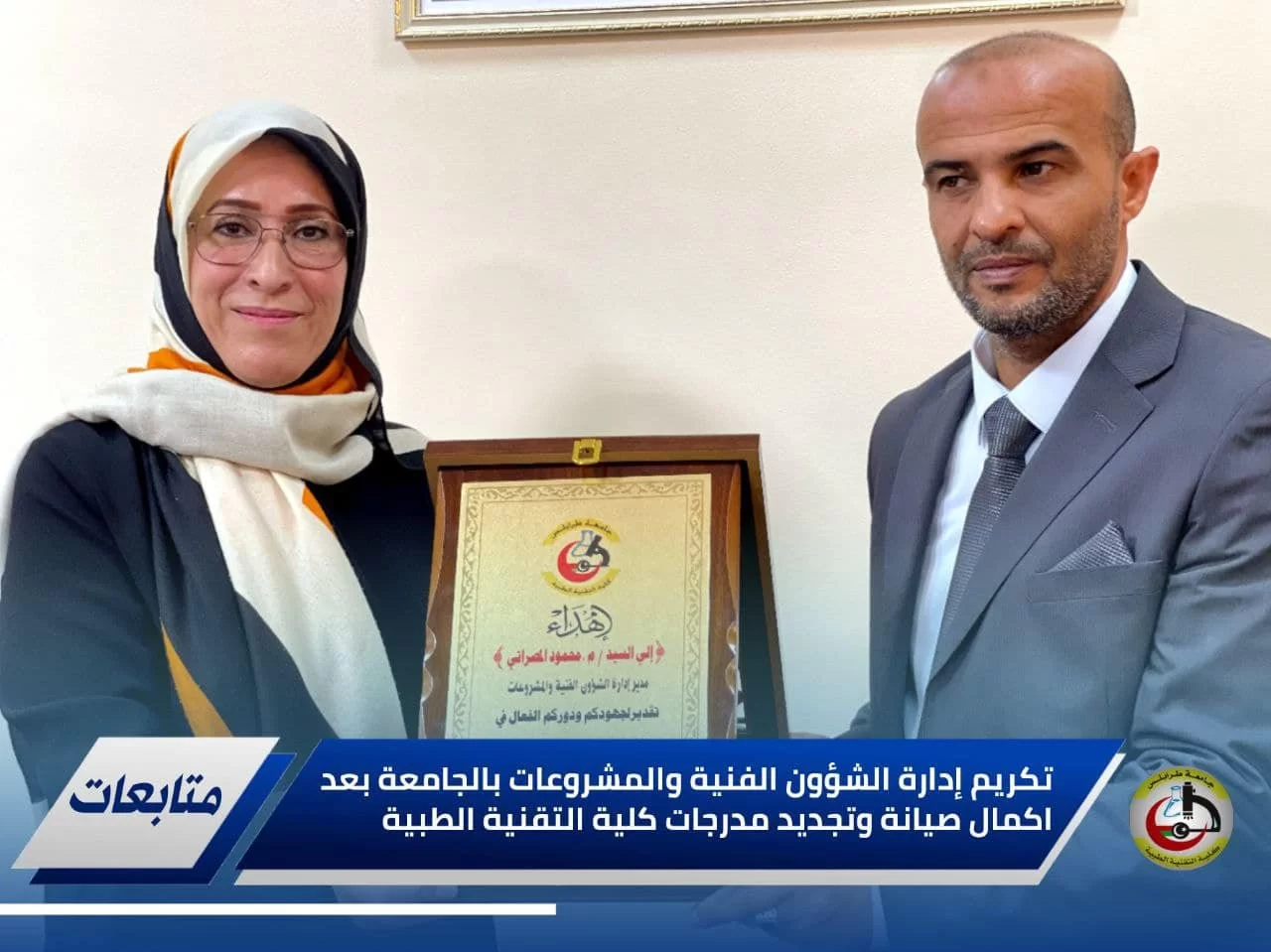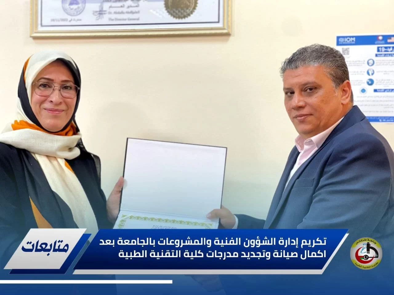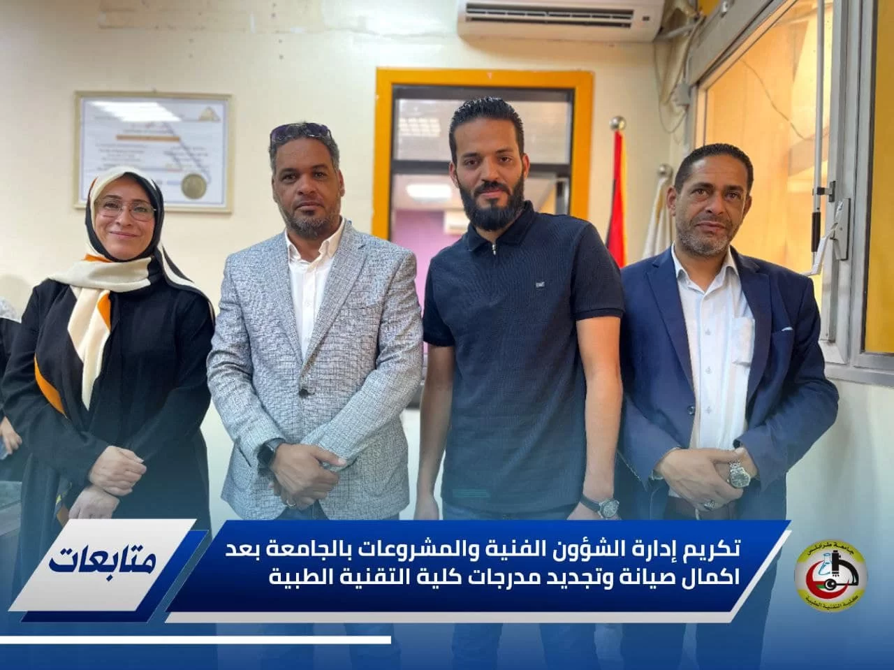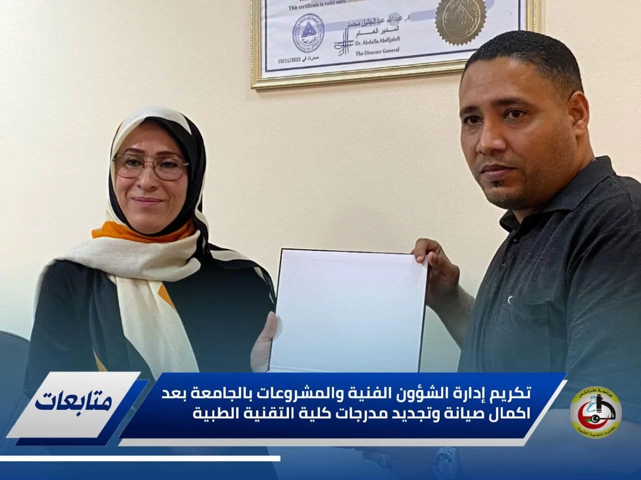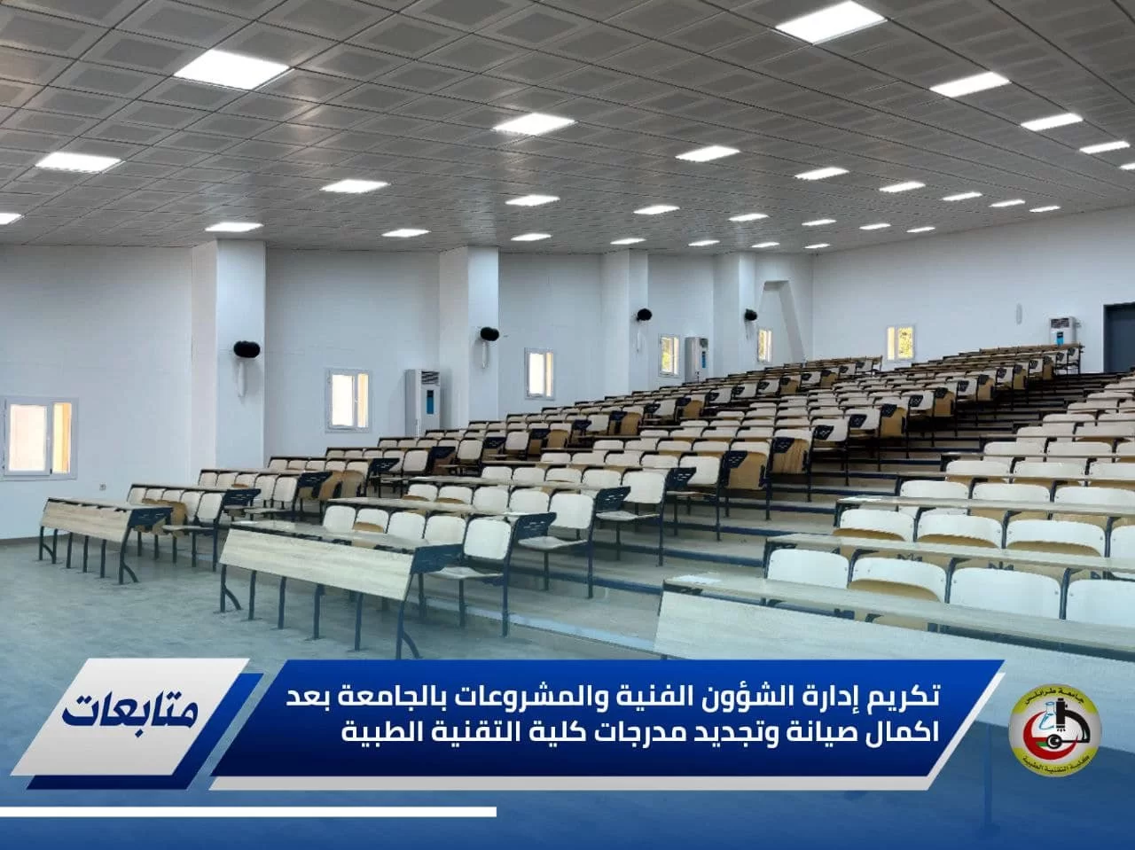 تم الانتهاء من تحسين المنظر الجمالي للكلية وكدلك الانتهاء من صيانة المدرجات بها ومن هنا حرصت ادارة الكلية المتمثلة في عميد الكلية ا.د عائشة قشوط والسادة مدراء المكاتب والادارات ورؤساء الاقسام.. يسر إدارة الكلية أن تتقدم بكل آيات الشكر والعرفان إلى مدير إدارة الجامعة بالجامعة / محمود المصراتي و م .عرفه الفرجاني ورئيس لجنة المدرجات بالجامعة السيد / .. عادل حسين تقديرًا لهم على عظيم جهودهم التي بذلوها بكل إخلاص في إنجاز العمل من أجل الكلية ، شاكرين لهم حرصهم على إنجازه بالشكل ، فبارك الله فيهم ووفقهم لما فيه خير الجميع