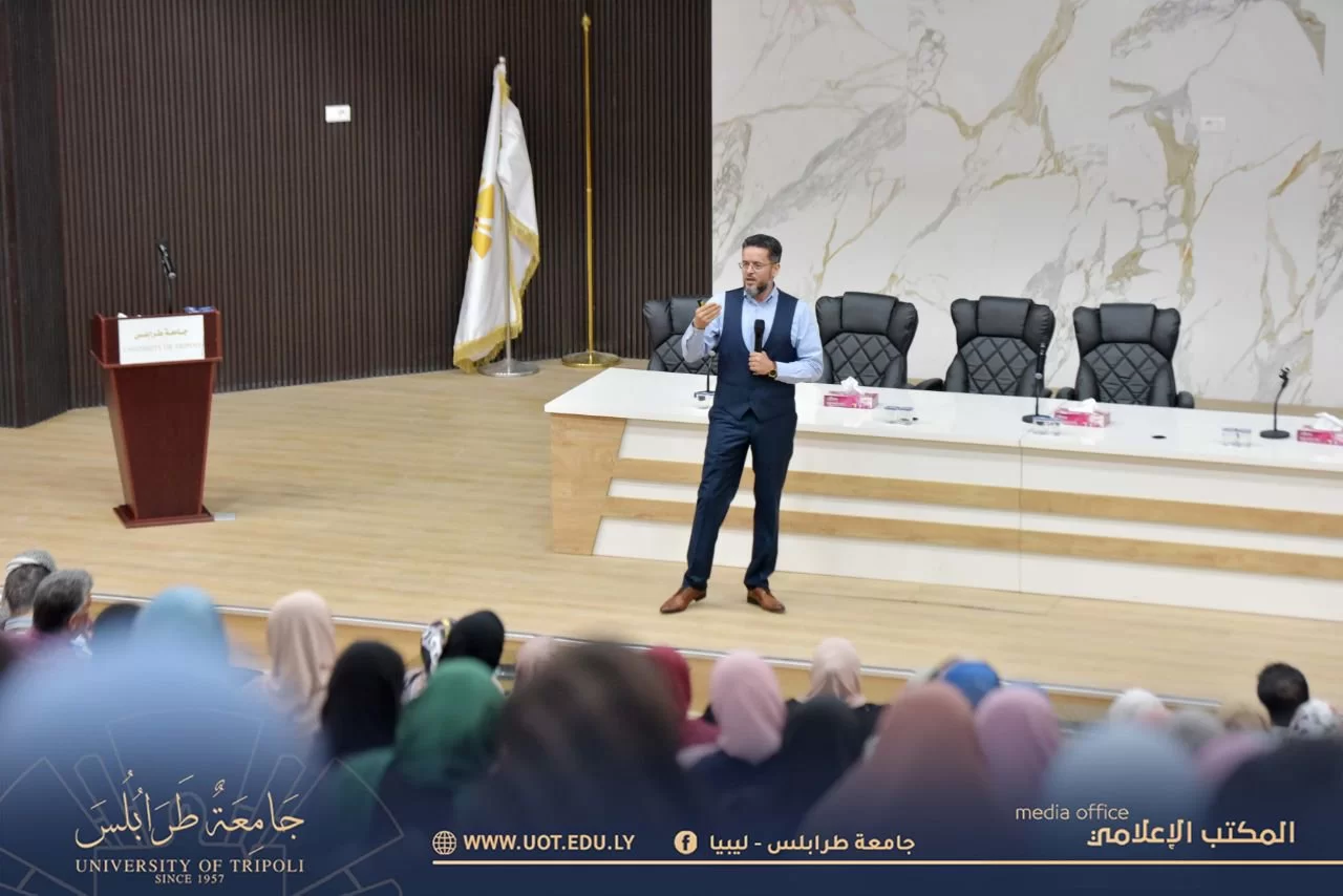 أُقيمت صباح اليوم الأحد الموافق 4 يونيو 2023 م بمدرج رشيد كعبار - جامعة طرابلس ورشة عمل بعنوان "مهارات العرض والإلقاء الأكاديمي" المُقامة من قِبل مركز البحوث والإستشارات والتدريب بجامعة طرابلس بإشراف السيد د. على عمر رمضان، حيث حضر الورشة عدد من أعضاء هيئة التدريس وطلبة الدراسات العُليا من داخل وخارج جامعة طرابلس.