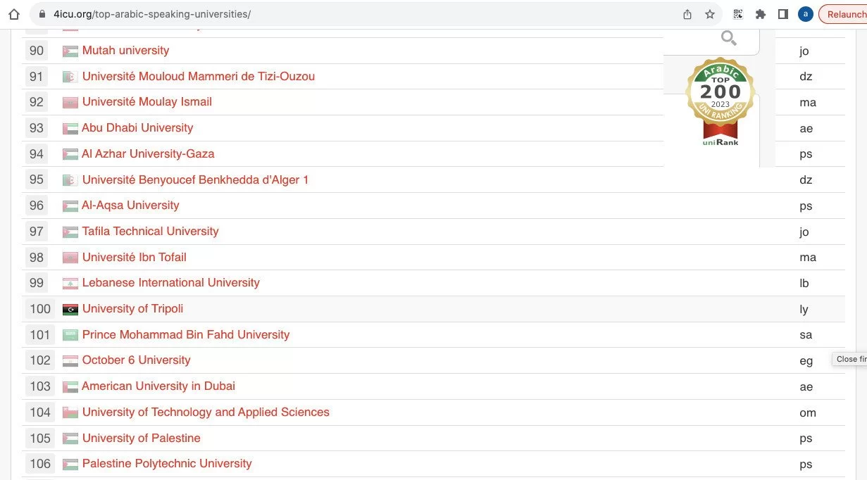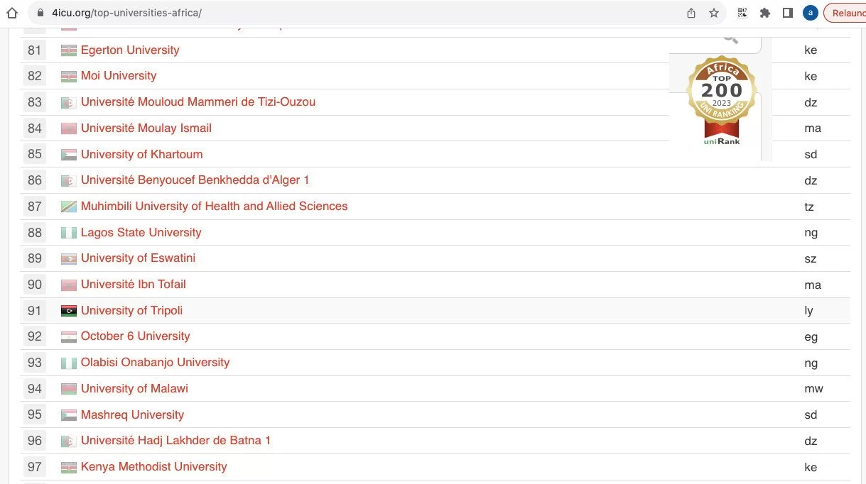 At the African level, the UoT was ranked at the 91st position. It was the only Libyan university that was present among the top 200 African universities.