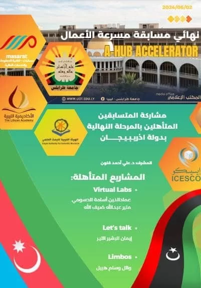 شارك فريق من رواد الأعمال بتمثيل دولة ليبيا في المسابقة الإقليمية لمسرعة ريادة الأعمال A-HuB Accelerator والتي تم تنفيذها بدولة أذربيجان في الفترة من 02 - 03 يونيو 2024 م، حيث تنافس فيها حوالي 33 مشروع ريادي من 11 دولة من دول منظمة العالم الإسلامي للتربية والعلوم والثقافة (الإيسيسكو).تم تنفيذ هذه المنافسة الإقليمية في إطار دعم منظمة الإيسيسكو للمشاريع الريادية المتميزة واستكمالاً للمسابقة المحلية التي تم تنفيذها سنة 2023 م تحت إشراف جامعة طرابلس. تأتي هذه المسابقة بهدف تشجيع رواد الأعمال من الشباب والطلبة على فتح باب الشراكات الناشئة ومساعدتهم في تطوير أفكارهم ومشاريعهم من أجل إطلاق شراكات ناجحة تساهم في بناء اقتصاد معزز بالتكنولوجيا ومبني على الابتكار والإبداع.يُجذير بالذكر بأنّ المسابقة المحلية لمسرعة ريادة الأعمال A-HuB Accelerator قد بدأ تنفيذها في بداية سنة 2023 م واختتمت في نهاية شهر أغسطس في العام ذاته، وكان ترتيب المشاريع المتميزة كالآتي: الترتيب الأول مشروع "هيا نتكلم" لإيمان البشير التير.الترتيب الثاني مشروع "Limbos" لوائل وسام هبيل. الترتيب الثالث مشروع "المختبرات الافتراضية" لكل من منير عبد الله ضيف الله وعماد الدين أسامة الحسومي.تمت مشاركة الفريق الليبي في المسابقة المقامة بدولة أذربيجان عن طريق كل من وائل وسام هبيل وعماد الدين أسامة الحسومي، بالإضافة إلى المنسق الوطني للمبادرة السيد د. علي أحمد قنون.
