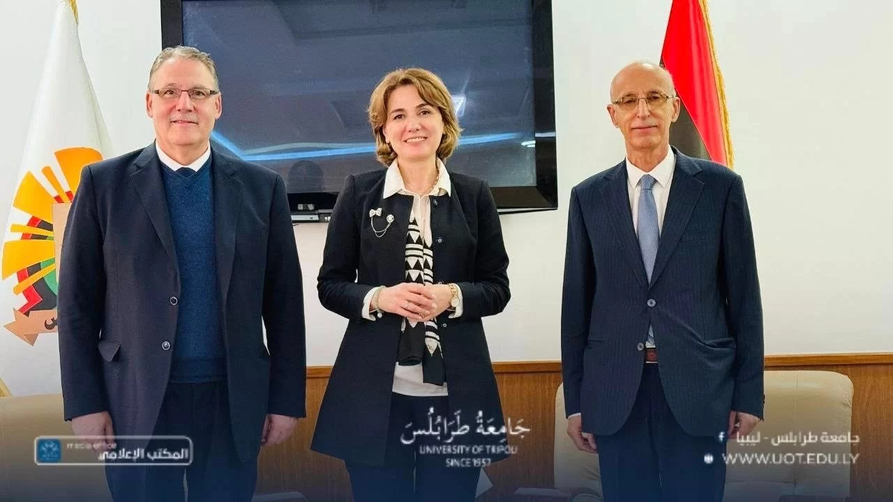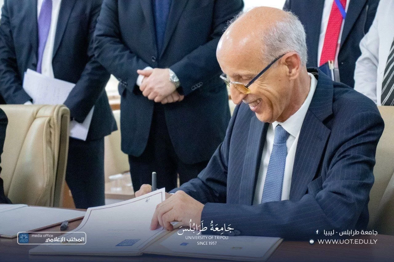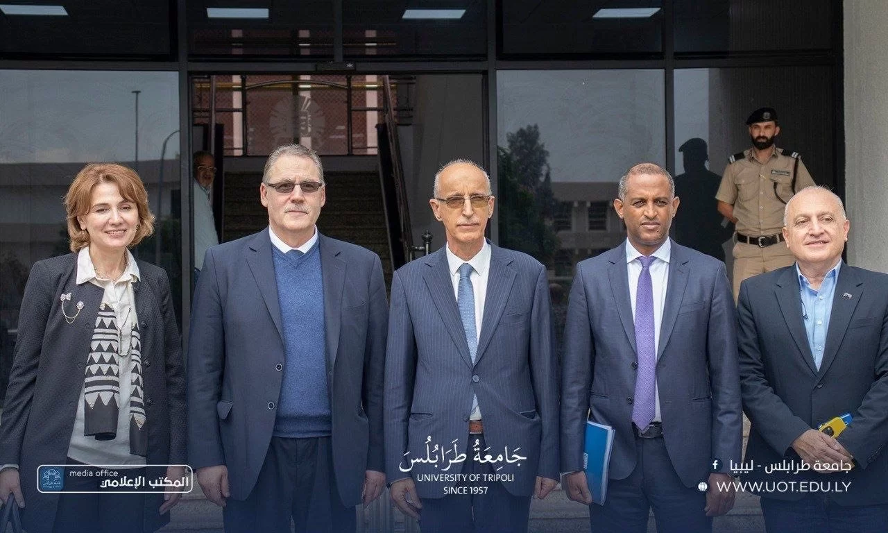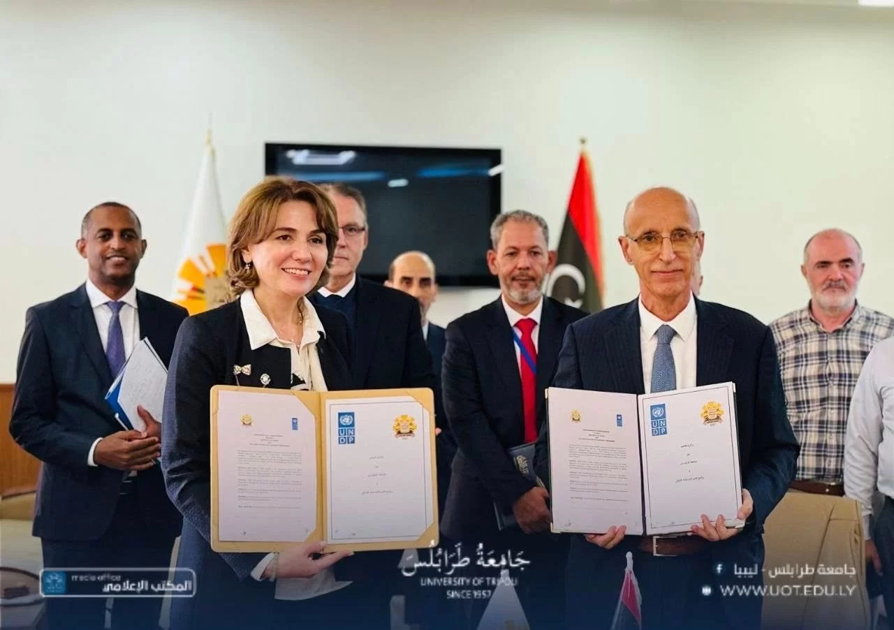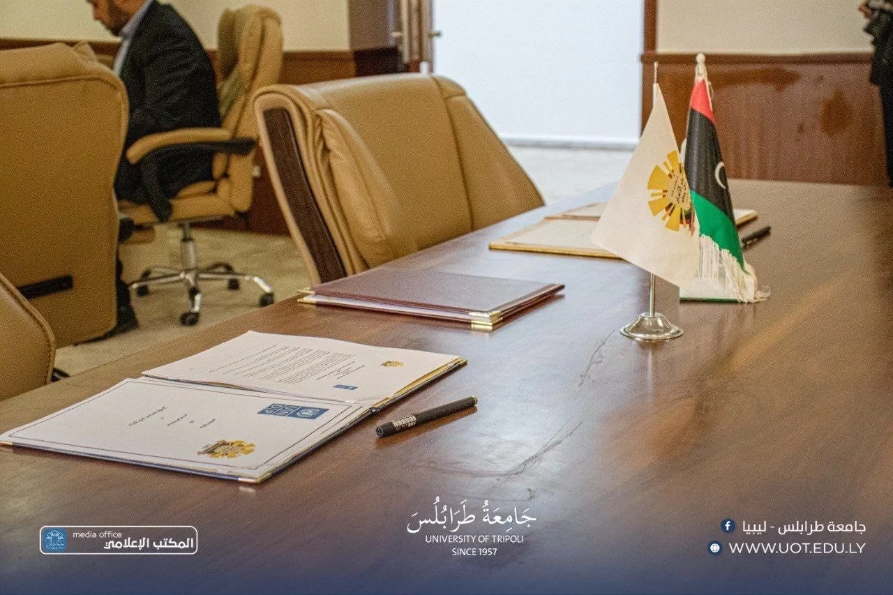 The President of the University of Tripoli, Prof. Khaled Oun, received on Tuesday, November 4th, 2025, a high-level delegation from the United Nations Development Programme (UNDP), headed by Mr. Abdallah Al Dardari, Assistant Secretary-General of the United Nations and Regional Director for Arab States. He was accompanied by Ms. Sophie Kemkhadze, UNDP Resident Representative in Libya, and Mr. Mohamed Saleh, Deputy Resident Representative.During the visit, a cooperation agreement was signed between the University of Tripoli and UNDP, aiming to support sustainable development initiatives and to enhance the university’s capabilities in research, innovation, and institutional capacity-building—contributing to community service and advancing Libya’s development goals.The discussions also addressed ways to strengthen educational institutions and integrate artificial intelligence technologies into academic and administrative processes through regional and international partnerships facilitated by UNDP, thereby improving institutional performance and modernizing the university’s digital infrastructure.Both parties further discussed the potential engagement of senior and retired university professors in academic and scientific consulting activities, utilizing their extensive experience to support UNDP-led development programs in collaboration with the University of Tripoli.In his remarks during the signing ceremony, Prof. Khaled Oun emphasized the university’s commitment to expanding cooperation with international organizations, particularly those focused on development and capacity building, describing this agreement as an important step toward aligning the university with national and international development projects.For his part, Mr. Abdallah Al Dardari praised the academic and research role of the University of Tripoli, affirming UNDP’s readiness to support the university’s initiatives and projects that contribute to human and economic development in Libya.The signing ceremony was attended by:Prof. Khaled Ghouma, Vice President for Academic Affairs,Prof. Radwan Hussein, Director of the International Cooperation Office,and Dr. Abdusalam Nwesri, Director of the Research and Consulting Center,along with representatives from relevant institutions.