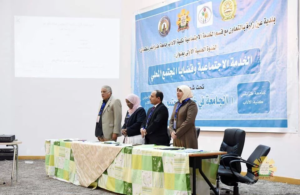 افتتحت صباح اليوم الاحد الموافق للسابع عشر من مارس 2019م، بمدرج رشيد كعبار الندوة العلمية الاولى بعنوان (الخدمة الاجتماعية وقضايا المجتمع المحلي).وتحت شعار "الجامعة في خدمة المجتمع " وذلك بالتعاون بين بلدية عين زارة وقسم الخدمة الاجتماعية بكلية الآداب جامعة طرابلس، والتي تستمر على مدى يومين، وقد حضر الافتتاح رئيس جامعة طرابلس الأستاذ الدكتور "نبيل النطاح "والدكتور "إبراهيم بوفائد" وكيل الكليات الإنسانية، وعميد بلدية عين زارة السيد "عبد الواحد البلوق" وعميد كلية الآداب الدكتور "خالد غومة" وبعض من عمداء الكليات ورؤساء الأقسام وأعضاء هيئة التدريس والطلبة،حيث اكد رئيس الجامعة خلال كلمته على شكره وتقديره لكل الجهود المبذولة من اجل نجاح هذه الندوة وتمنى أن يكون هذا الملتقى مثمر ويخدم المجتمع والمواطن. وقد شهدت الندوة مناقشة بعض الورقات العلمية ومن بينها ورقة بعنوان (دور الدراسات والبحوث في تنمية المجتمع المحلي) للدكتور خالد التومي، واُخرى بعنوان (عين زارة في التخطيط الحضري) للمهندس مفتاح علي، وورقة ثالثة تناولت (التنمية الشاملة في خدمة المجتمع المحلي) للدكتورة مها الورفلي والدكتورة ايناس خليل.