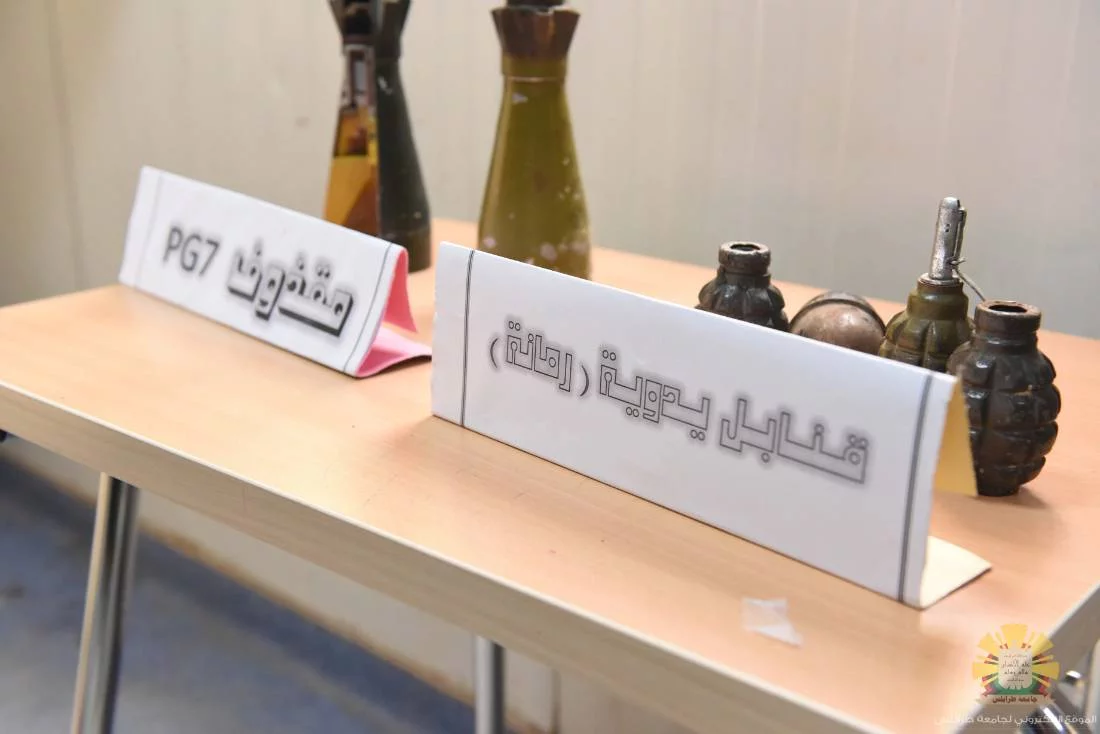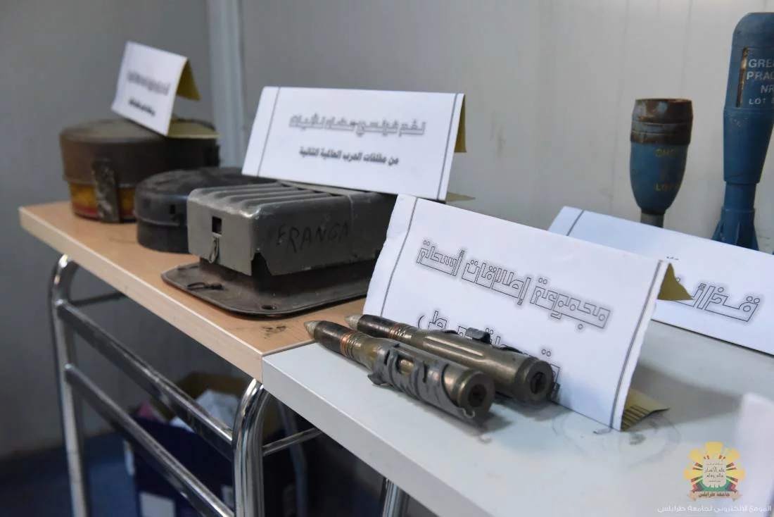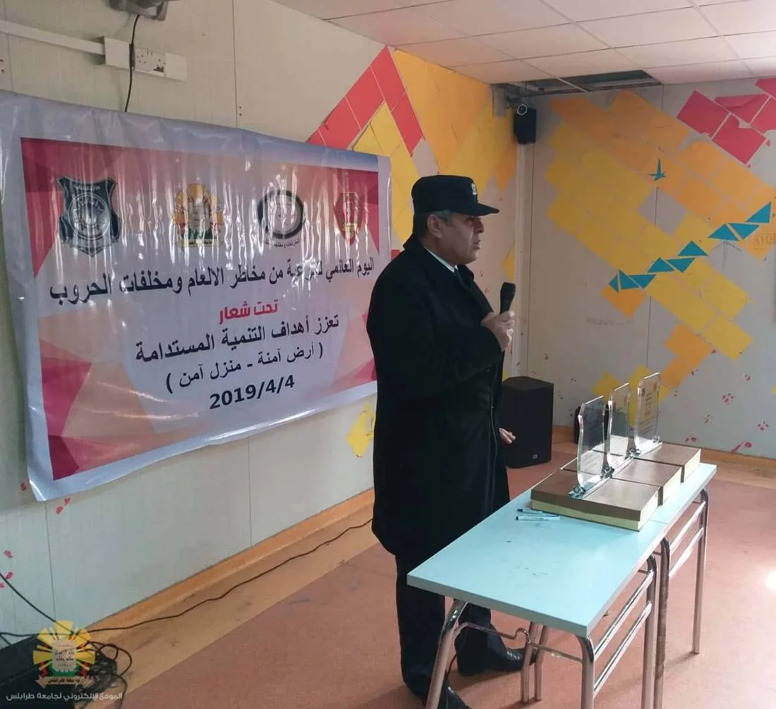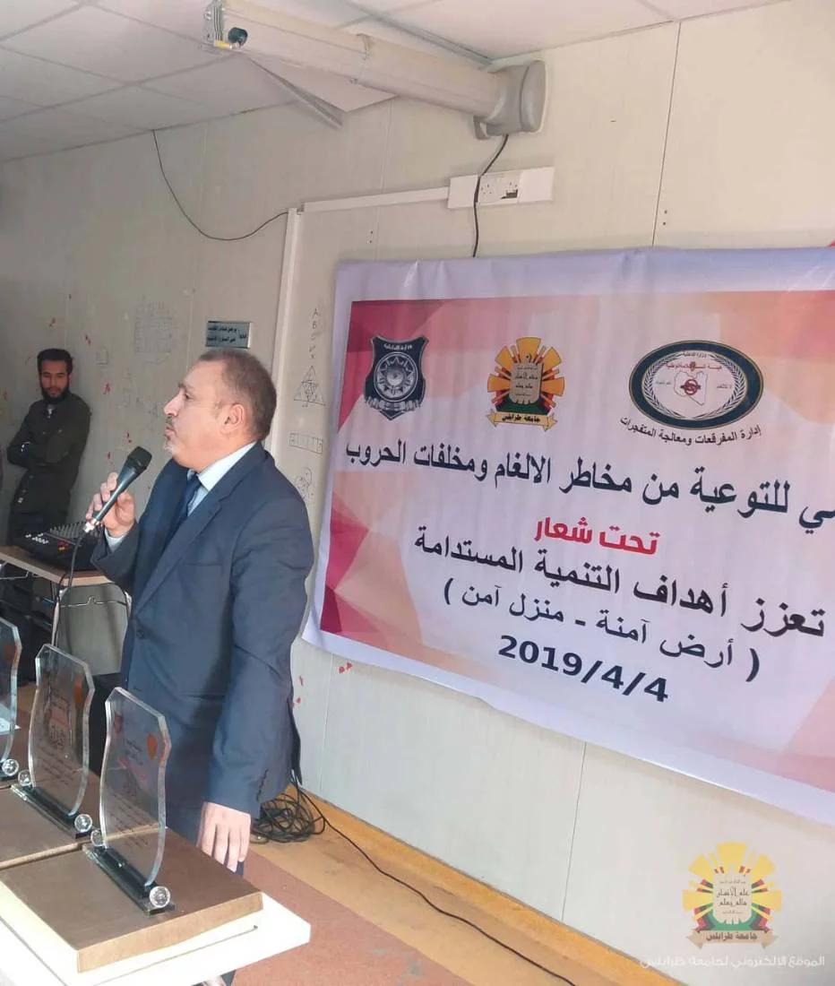 نظمت صباح اليوم الخميس الموافق للرابع من ابريل 2019 بكلية الفنون والاعلام احتفالية اليوم العالمي للتوعية من مخاطر الالغام والمتفجرات تحت شعار (تعزيز اهداف التنمية المستدامة - ارض امنة - منزل امن) باشراف مكتب العلاقات والاعلام بالتعاون مع اتحاد طلبة كلية الفنون والاعلام، حيث أقيمت محاضرة توعوية عن مخاطر مخلفات الحروب.وقد حضر الاحتفالية الاستاذ الدكتور "نبيل النطاح" رئيس جامعة طرابلس، والدكتور "ابراهيم ابوفائد" وكيل الجامعة للكليات الانسانية، والدكتور "عبدالكريم كندير" عميد الكلية، والعميد "صالح الجبالي" مدير فرع الغربية، والعقيد "بشير بلعيد" مدير ادارة التخطيط بالهيئة، وبعض من اعضاء هيئة التدريس والطلبة وعناصر من وزارة الداخلية.هذا وقد أقيم معرض لمخلفات الحرب بالمناسبة، حيث قام الحضور بالاطلاع والاستماع للشروح حول هذه المخلفات وطرق الوقاية منها وتوعية المواطنيين بمخاطر الالغام والمتفجرات التى تشكل خطر على حياتهم.