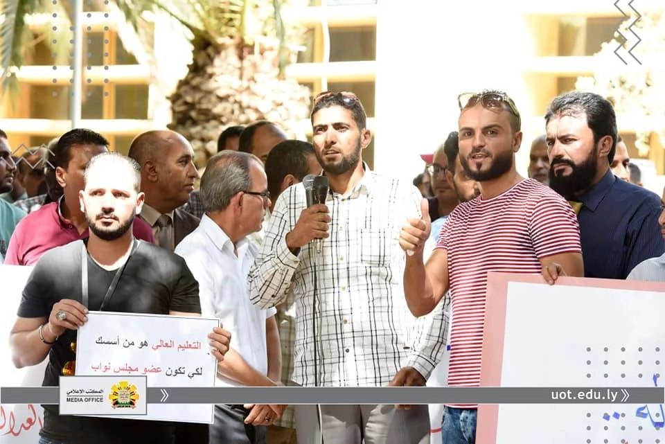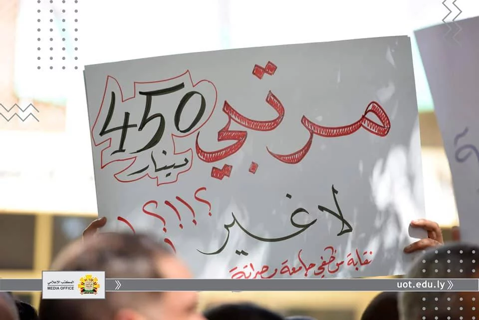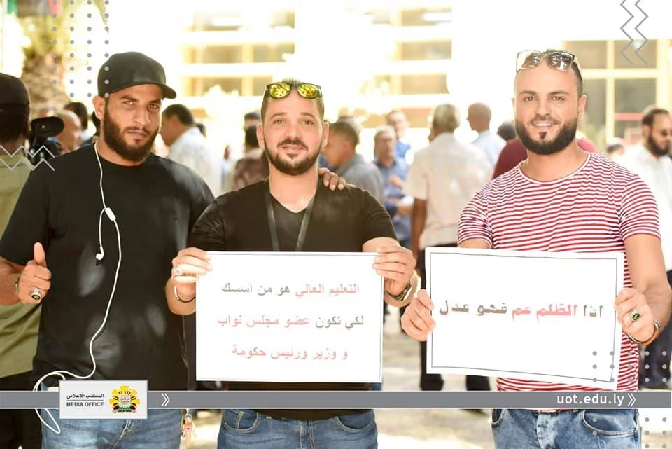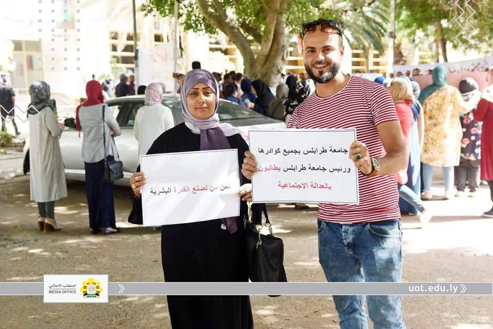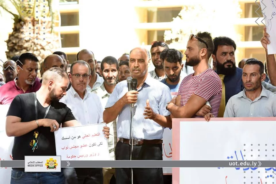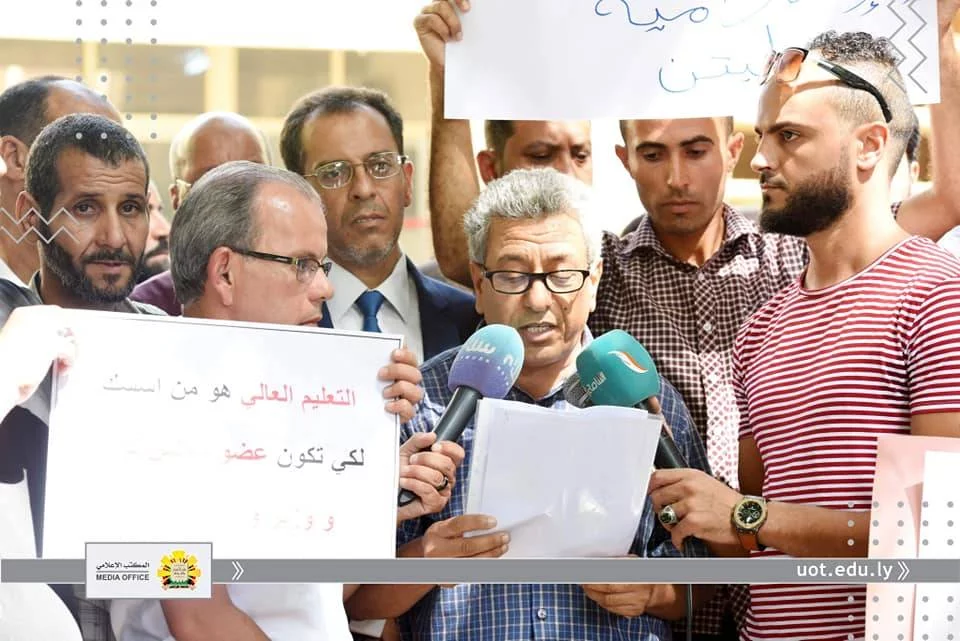 انطلاقا من أن مؤسسات التعليم العالي بكافة مكوناتها "أعضاء هيئة تدريس وموظفين" تعد من أهم ركائز المجتمع وأن توفير كافة الحقوق لهم دليل على رُقي المجتمع وتقدمه.ومن هذا المنطلق نظمت نقابتي موظفي وأعضاء هيئة التدريس جامعة طرابلس، صباح اليوم الأربعاء الموافق الثامن عشر من سبتمبر 2019م، وقفة احتجاجية أمام مقر رئاسة الجامعة، وذلك للمطالبة بزيادة مرتباتهم واعتماد جداول المرتبات المقترحة والمتوازنة مع الوظيفة والمؤهل والخبرة المتناسبة مع الوظائف الأخرى داخل الدولة الليبية والمحققة لميزان العدالة الاجتماعية.