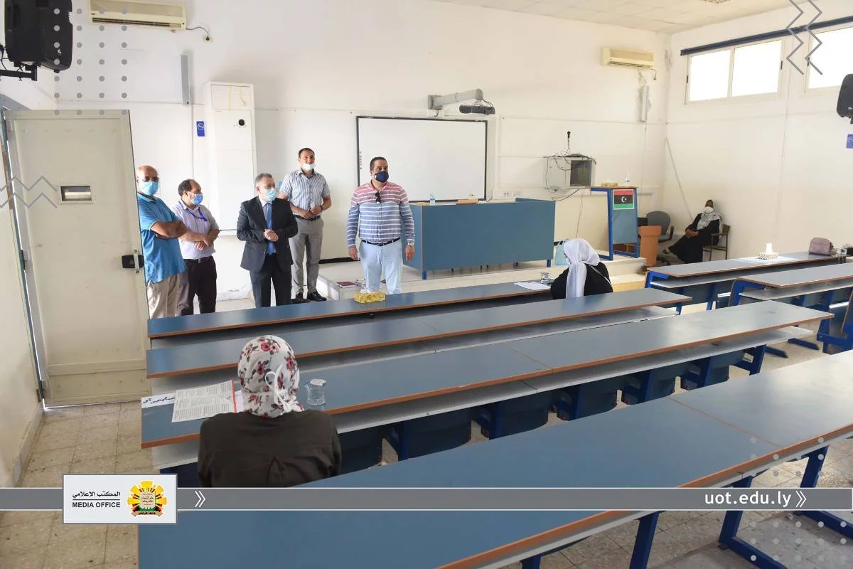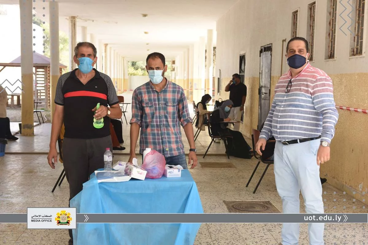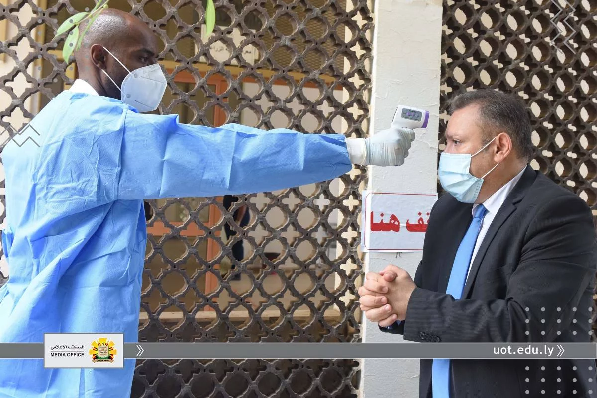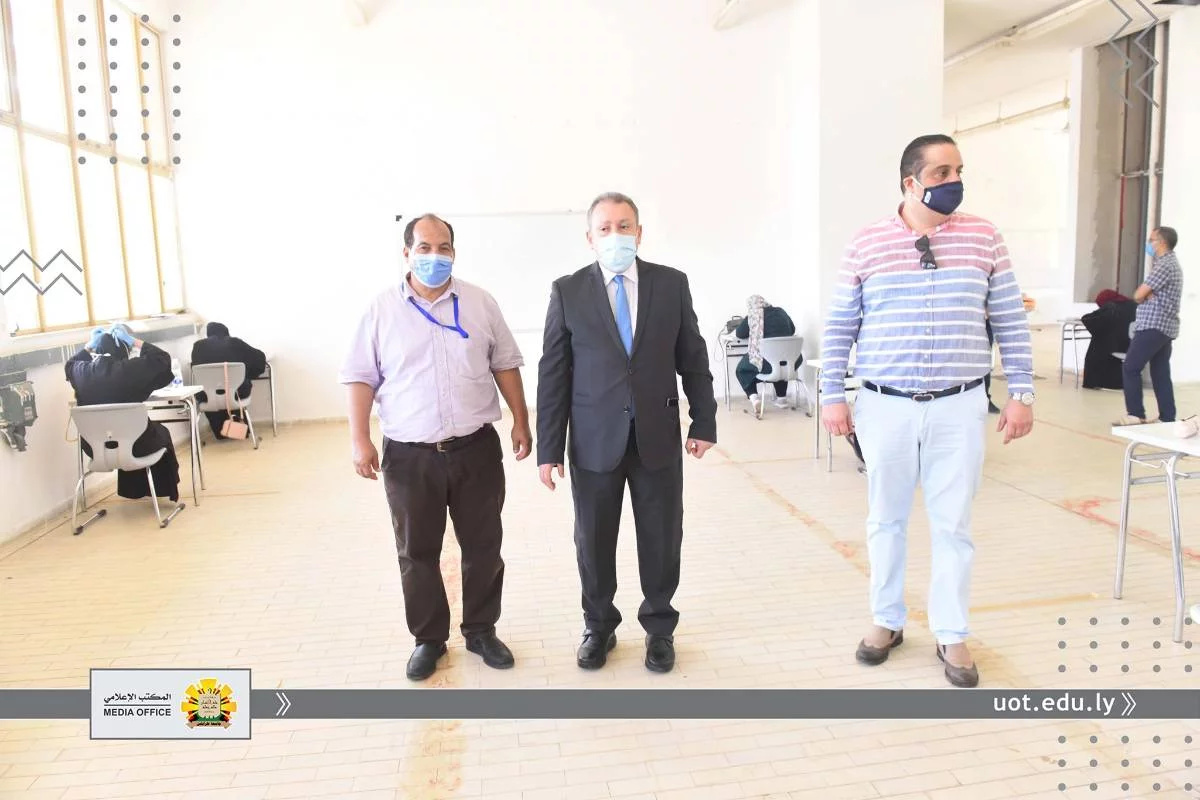 تفقد رئيس جامعة طرابلس "أ. د. نبيل النطاح" صباح اليوم الأحد ، رفقة وكيل الكليات الطبية-رئيس لجنة مكافحة جائحة كورونا المستجد "أ. د. عبد الرزاق العوزي"، قاعات ومدرجات الامتحانات وشملت الزيارة كلية الصيدلة- الزراعة- الطب البيطري- الآداب ، حيث اطلع من خلالها على الإجراءات الاحترازية والوقائية التي تقوم بها الجامعة في اليوم الأول لبدء الامتحانات. وأكّد السيد الرئيس خلال لقاءه بالكوادر العلمية والإدارية بالكليات على الجانب التعليمي والجانب الصحي لآلية التنفيذ التي وضعتها الجامعة لعودة الامتحانات لأبنائنا الطلبة، والتي تمت الموافقة عليها من قبل اللجنة العلمية الاستشارية لمكافحة جائحة كورونا المستجد، وتحقيق شروط السلامة الصحية من حيث التباعد بين الطلاب، وعدم وجود أي مظاهر للازدحام والتجمعات.وفي التصريح للناطق الرسمي باسم اللجنة المركزية العليا لعودة الدراسة "أ. هيثم الرتيمي" أكد أن الكليات اتخذت جميع شروط السلامة الصحية من حيث تعقيم القاعات والمدرجات، وتأمين أجهزة اختبار الحرارة، وتوفير المعقمات اللازمة، متمنياً لأبنائنا الطلبة كل التوفيق والنجاح لمتابعة دراستهم وتعويض الفاقد العلمي.
