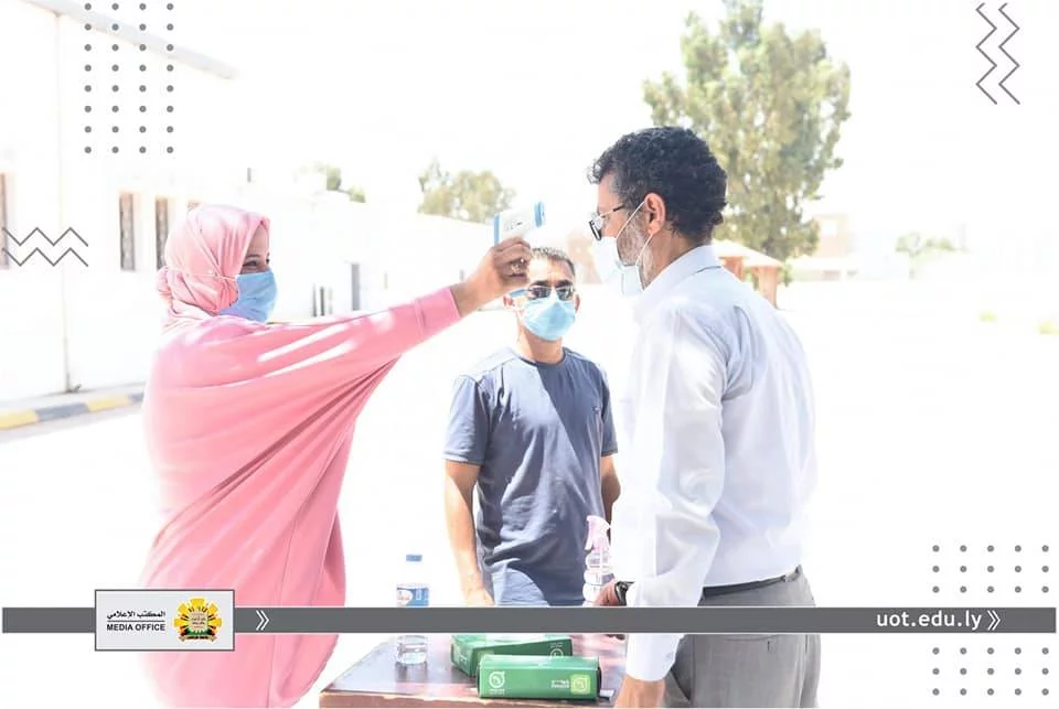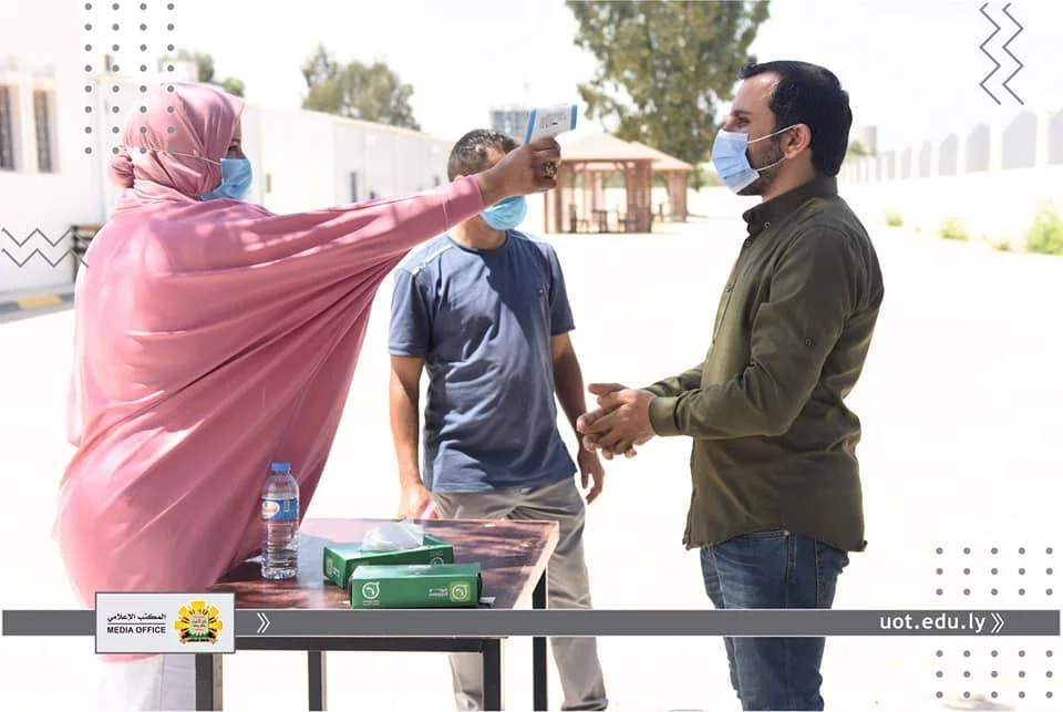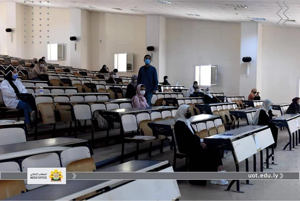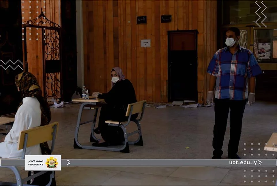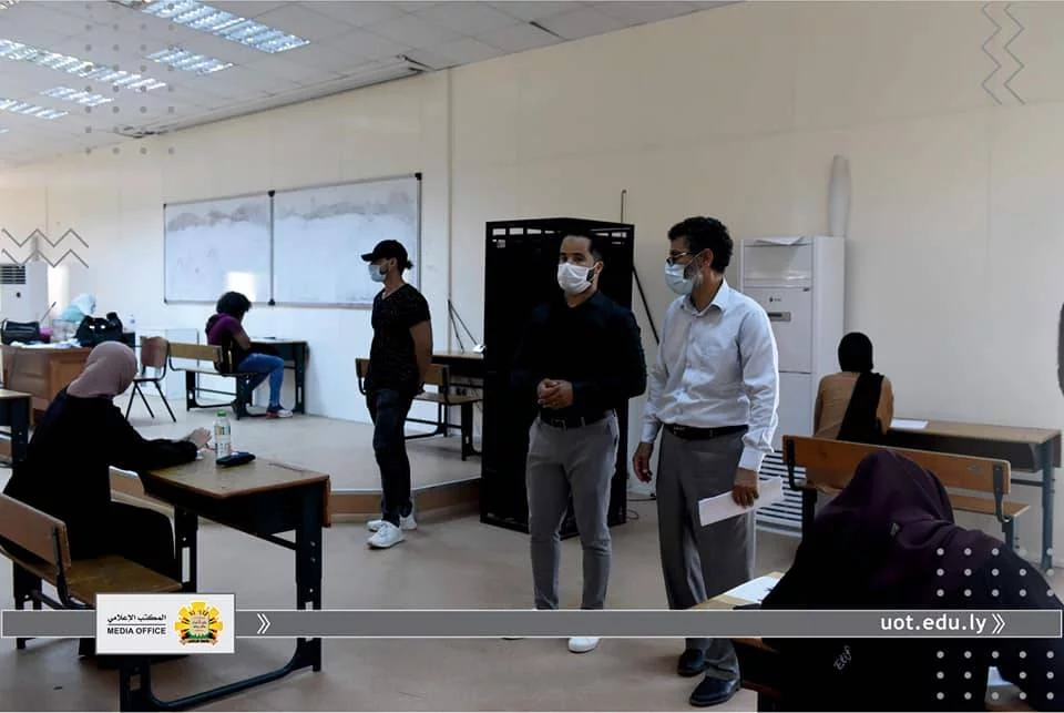 في إطار متابعة المكتب الإعلامي لجامعة طرابلس لسير الامتحانات النهائية داخل الجامعة، قامت عدسة المكتب يوم الثلاثاء الموافق للحادي عشر من أغسطس رفقة "أ. د. محمد السيد" عميد الكلية التقنية الطبية و "أ. أسامة حويته" مدير الشؤون الإدارية والمالية لكلية التقنية الطبية و "د. عبد الرؤوف الحاتمي" رئيس القسم العام ،برصد انطلاق الامتحانات النهائية للفصل خريف 2019م للقسم العام، والذي يعتبر من أكبر الأقسام في الكلية، حيث يصل عدد طلبة الي أكثر من 800 طالب وطالبة ،يتزامن ذلك مع اتباع كافة الإجراءات الاحترازية والوقائية من تعقيم واستعمال الكمامات والتباعد الجسدي.