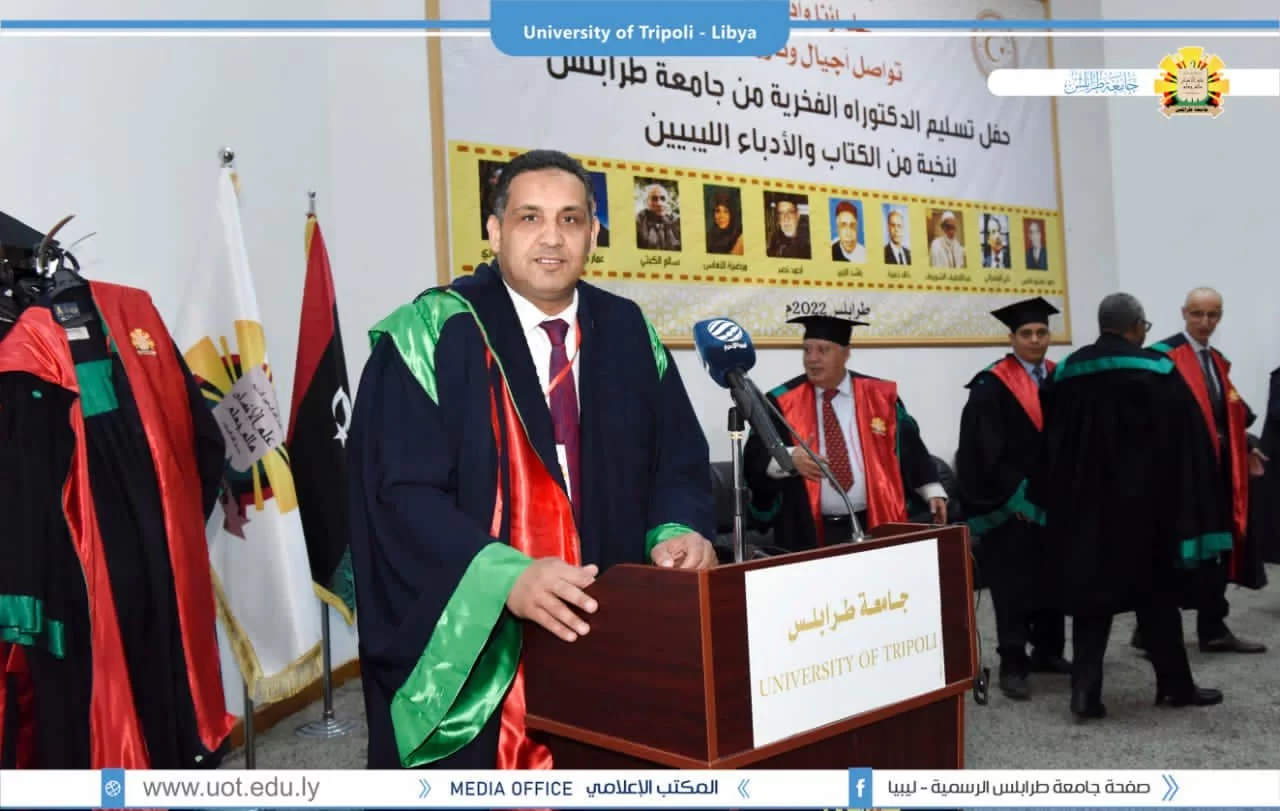 جامعة طرابلس ووزارة التعليم العالي والبحث العلمي يُكرمان نخبة من الكُتّاب الأدباء الليبيين .طرابلس 5 مارس 2022م.أُقيم صباح اليوم السبت بمدرج رشيد كعبار حفل تسليم الدكتوراء الفخرية من جامعة طرابلس لنخبة من الكُتّاب والأُدباء الليبيين من قبل رئاسة جامعة طرابلس ووزارة التعليم العالي والبحث العلمي، حيث شارك في التكريم السيد أ.د. خالد عون رئيس جامعة طرابلس رفقة السيد د. عمران القيب وزير التعليم العالي والبحث العلمي وبحضور كلاً من السيد وزير الثقافة المُكلف والسيد وزير البيئة والسيد وكيل وزارة التربية والعليم والسيد رئيس جامعة الزاوية والسيد رئيس جامعة صبراته والسيد رئيس جامعة بني وليد والسيد رئيس جامعة الزيتونة وعدد من السادة العمداء والوكلاء بالكليات.