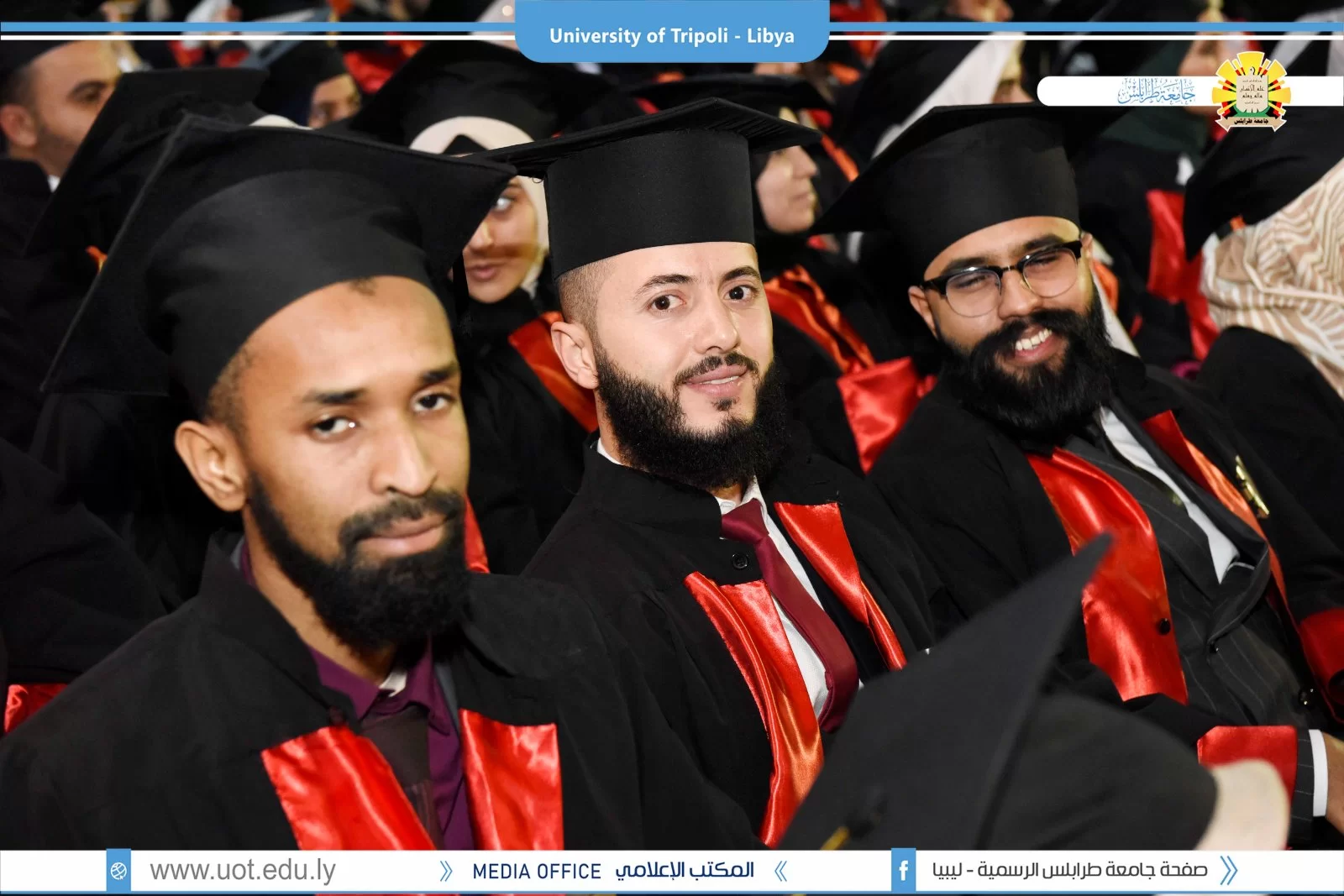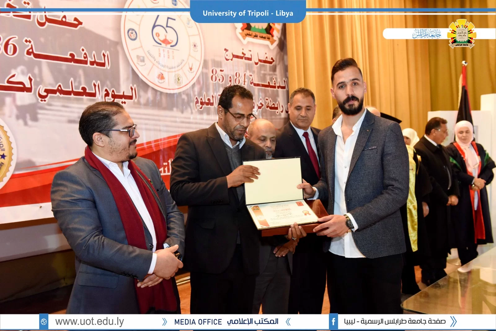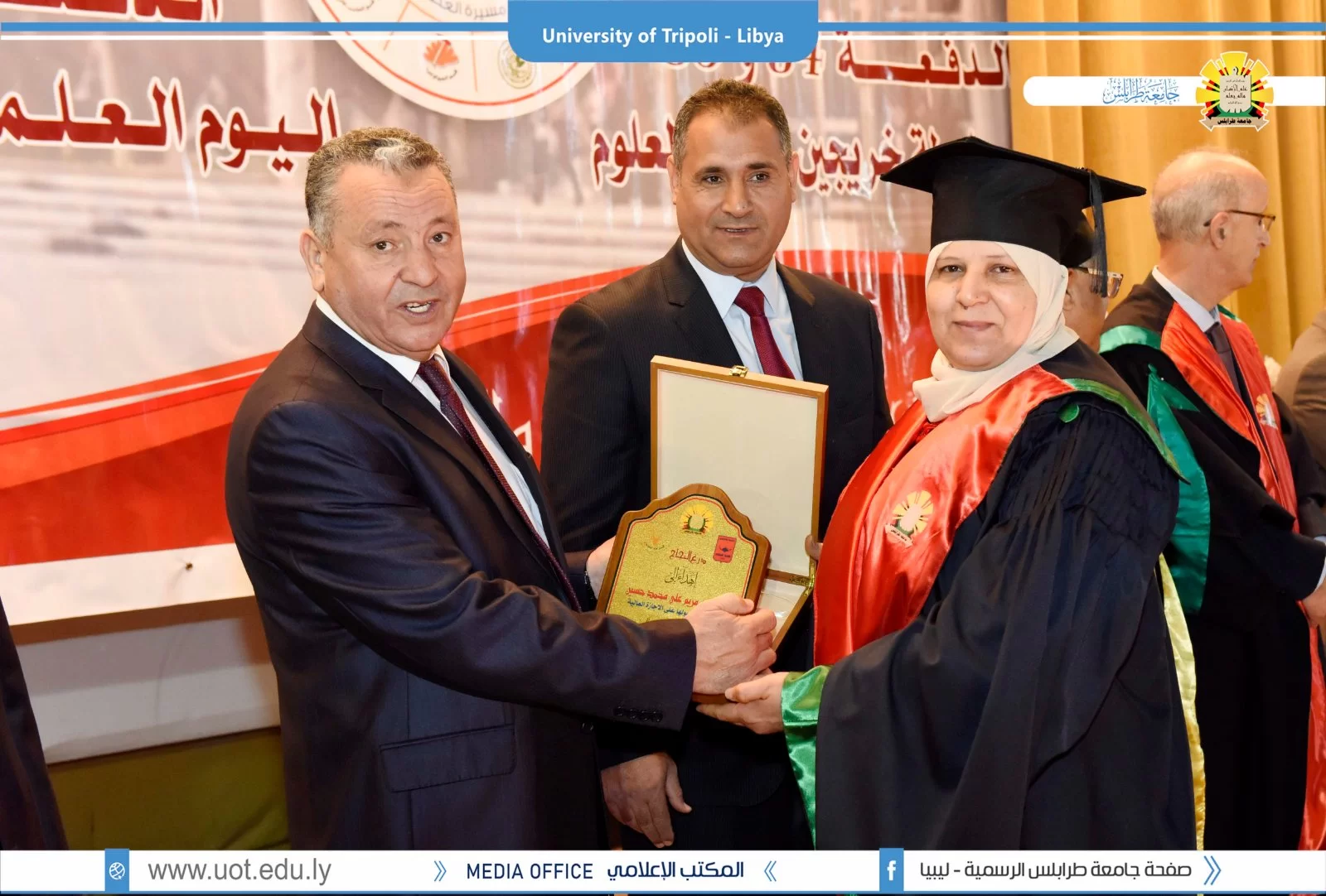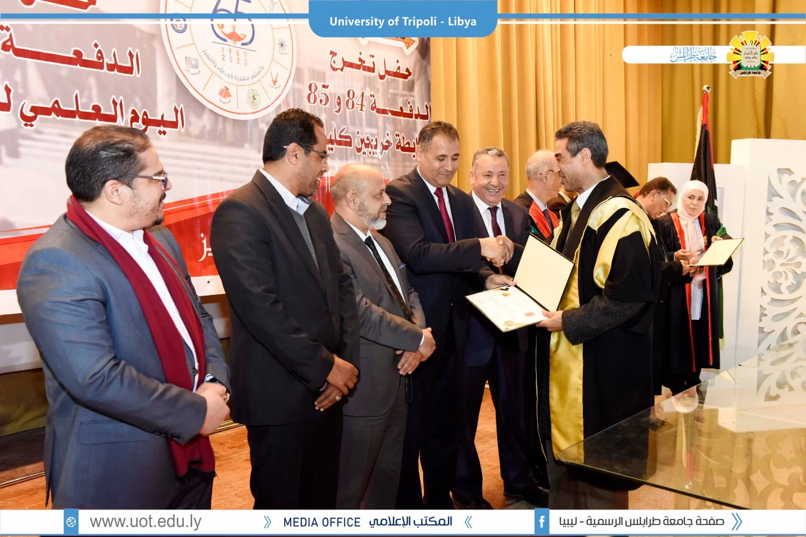 كلية العلوم تحتفل بالعيد الخامس والستين لإنشائها.طرابلس 21 مارس 2022م.أقيم صباح اليوم الإثنين بمسرح كلية العلوم إحتفالية بمناسبة العيد الخامس والستين لإنشاء كلية العلوم بجامعة طرابلس وقد حضر الإفتتاحية كلاً من السيد أ.د. عمران القيب وزير التعليم العالي والبحث العلمي والسيد وكيل وزارة البيئة والسيد أ.د. خالد عون رئيس جامعة طرابلس والسيد د. خالد غومة وكيل الجامعة للشؤون العلمية والسيد د. رمضان الجدي عميد كلية العلوم وعدد من عمداء الكليات وأعضاء هيئة التدريس والموظفي والطلبة بكلية العلوم.هذا وقد تم تكريم عدد من دفعات الكلية من حملة الماجستير والبكالوريوس.