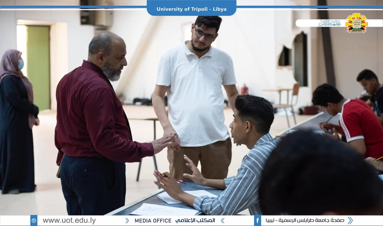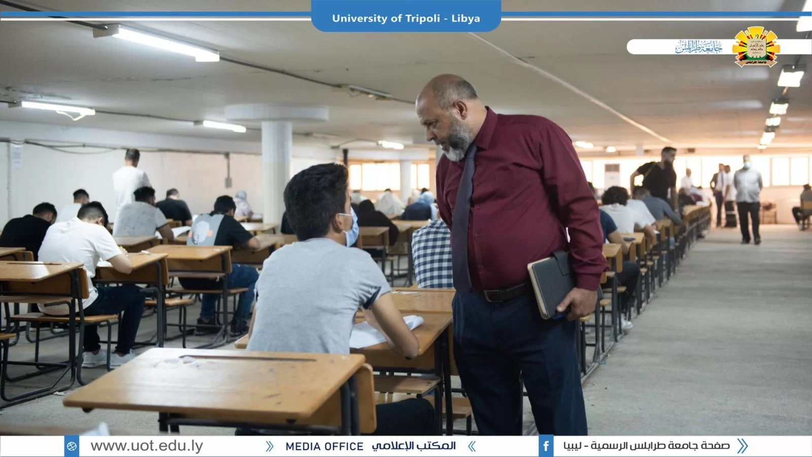 رئاسة جامعة طرابلس تتفقد الإمتحانات النصفية لطلبة المرحلة التمهيدية للعلوم التطبيقية طرابلس 28 مايو 2022 م قام السيد د. خالد غومة وكيل الجامعة للشؤون العلمية رفقة كل من د . ربيعة الغزيل منسقة المرحلة التمهيدية للعلوم التطبيقية و السيد د . علي مصدق المسجل العام بالجامعة و السيد أحمد ابورقيقة رئيس إتحاد طلبة جامعة طرابلس بجولة تفقدية لمتابعة سير الامتحانات النصفية للمرحلة التمهيدية للعلوم التطبيقية حيث تابع السيد وكيل الجامعة وضع اسئلة الإمتحانات النصفية من وجهة نظر الطلبة و مدى تغطية المنهج الدراسي من قبل أعضاء هيئة التدريس