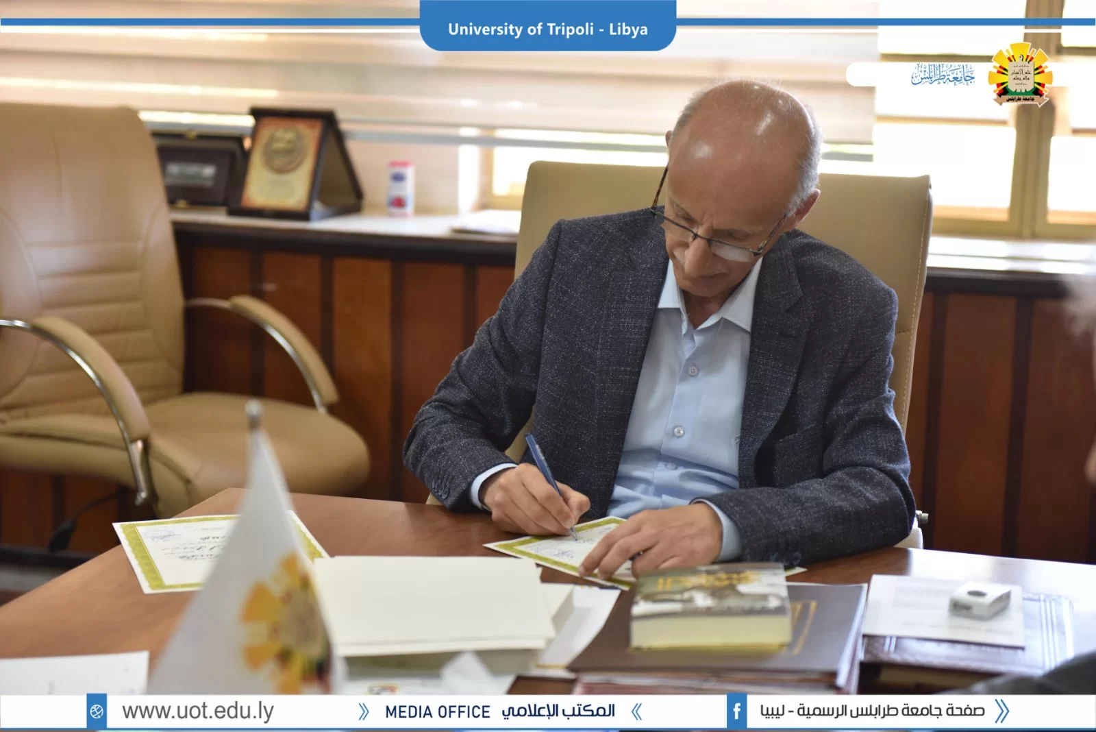 استقبل صباح اليوم السيد أ.د.خالد عون رئيس جامعة طرابلس بمكتبه السيد د.مصطفى يونس مؤلف كتاب (بالبو في المنفى)، وقد تناول اللقاء الحديث عن الكتاب وأهدافه وعلاقة ليبيا بإيطاليا من الناحية الثقافية .