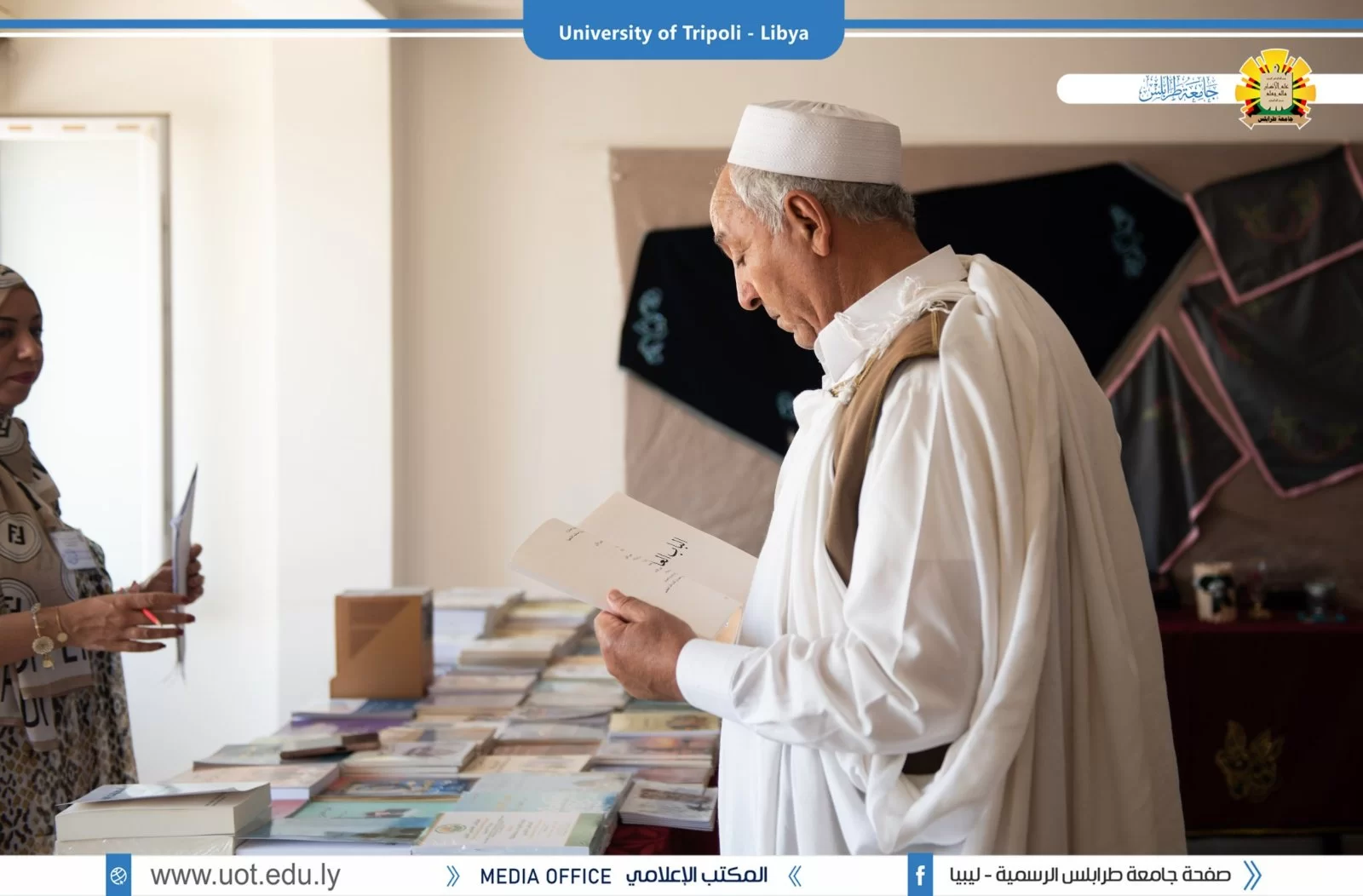 افتتح وكيل جامعة طرابلس للشؤون العلمية السيد د.خالد غومة يوم الأربعاء الموافق 29/28/6/2022 المعرض العلمي الثقافي التراثي الذي نظمه قسم الخدمة الاجتماعية بعنوان " أعمالنا تنطق" والذي شهد حضور كبيراً لعدد من الشخصيات، علي رأسهم السيد أ.د عبدالله مليطان عميد كلية الآداب والسيد د.فاضل جبران رئيس المصالحة الوطنية بمجلس الوزراء ورئيس اللجنة التحضيرية للملتقى المصالحة السيد أ.مسعود الغزيوي وبعض أعيان و وجهاء بلدية طرابلس والأدميرال بحار نوري داقو وم. أسامة حويته مدير إدارة النشاط بجامعة طرابلس وبعض رؤساء الأقسام العلمية بكلية الآداب وأعضاء هيئة التدريس والطلاب.