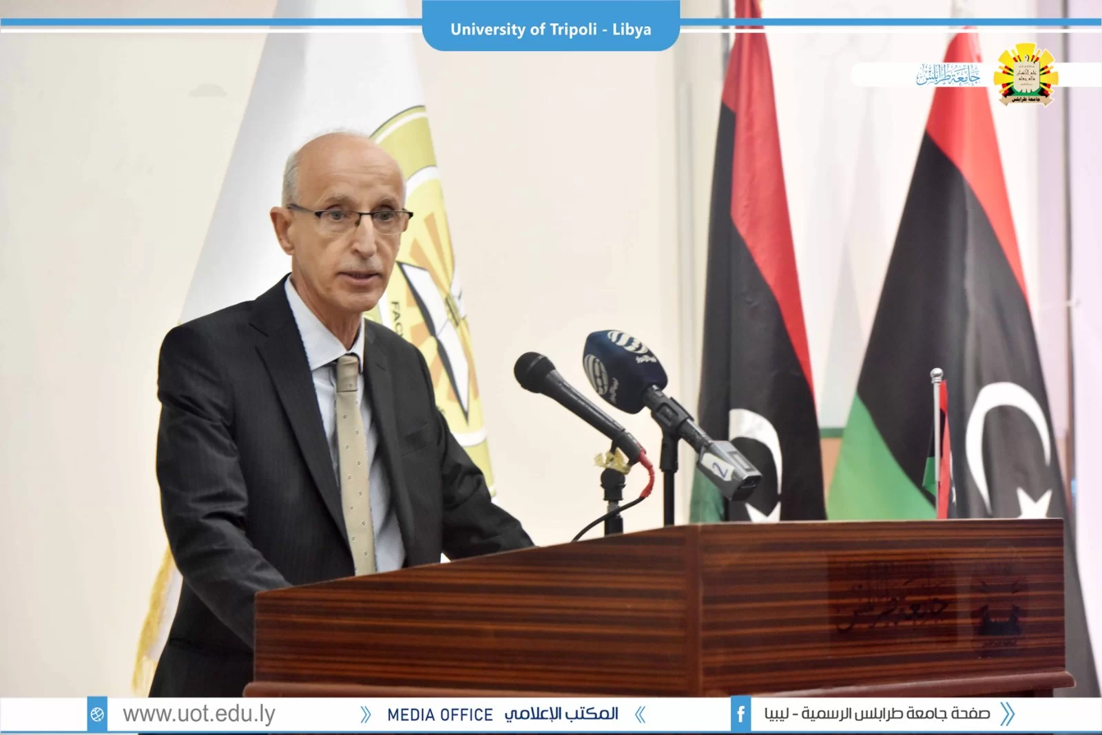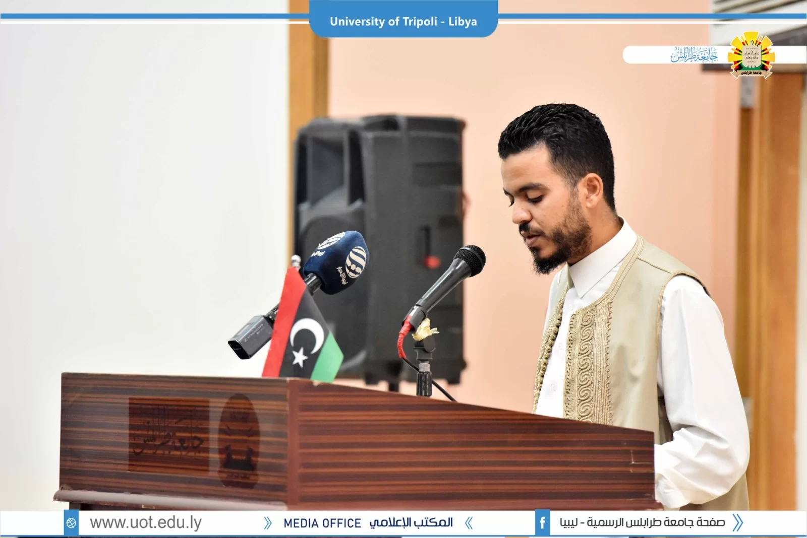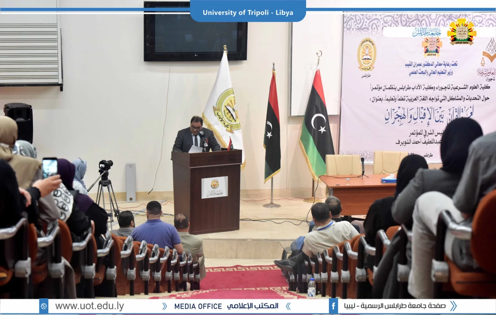 تم صباح اليوم الثلاثاء الموافق 27 سبتمبر 2022م بمبنى الكيمياء افتتاح مؤتمر التحديات و للمشاكل التي تواجه اللغة العربية تعلماً و تعليماً تحت عنوان "لغة القران بين الإقبال و الهجران" بحضور السيد أ.د. عمران القيب وزير التعليم العالي والبحث العلمي والسيد أ.د. خالد عون رئيس جامعة طرابلس والسيد د. خالد غومة وكيل الجامعة للشؤون العلمية والسيد أ. عبدالله الترهوني مدير المكتب الإعلامي بالجامعة و عميد كلية الآداب د. عبد الله مليطان والسيد عميد كلية العلوم الشرعية تاجوراء رفقة عدد من السادة عمداء الكليات ومدراء الإدارات بالجامعة. تم قص شريط افتتاح فقرات المؤتمر بخير ما يُفّْتَتح به تلاوة عطرة لآيات الذكر الحكيم بصوت القارئ أحمد أبو رقيقة تليها وقفة إجلال للنشيد الوطني منتقلين بعد ذلك لكلمات الحضور كلاً من السيد أ.د. خالد عون رئيس الجامعة و كلمة السيد أ.د. عمران القيب وزير التعليم العالي و البحث العلمي و بعض من شخصيات الحضور اختتاماً بكلمة الرئيس الشرفي للمؤتمر د. عبد اللطيف الشويرف، كما تم افتتاح معرض منوع لخطوط المصحف الشريف من ضمن البرنامج التنظيمي للمؤتمر. و ننوه على أن المؤتمر سيستمر لمدة يومين متتاليين مشبعين بفائدة عظيمة، حيث سيتم تقسيم اليومين إلى عدة فقرات تشمل جلسات علمية و حلقات نقاش، و في الآخر تسليم شهادات المشاركة. و بذلك نتقدم بالشكر و العرفان للقائمين على إنجاح المؤتمر بالشكل المطلوب.