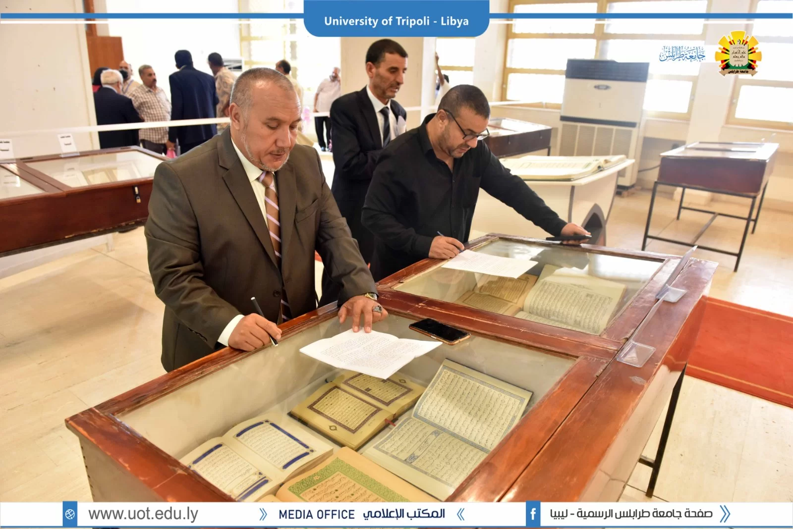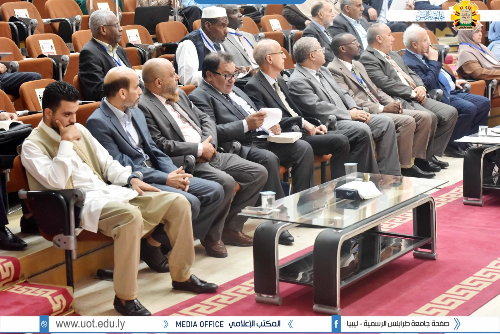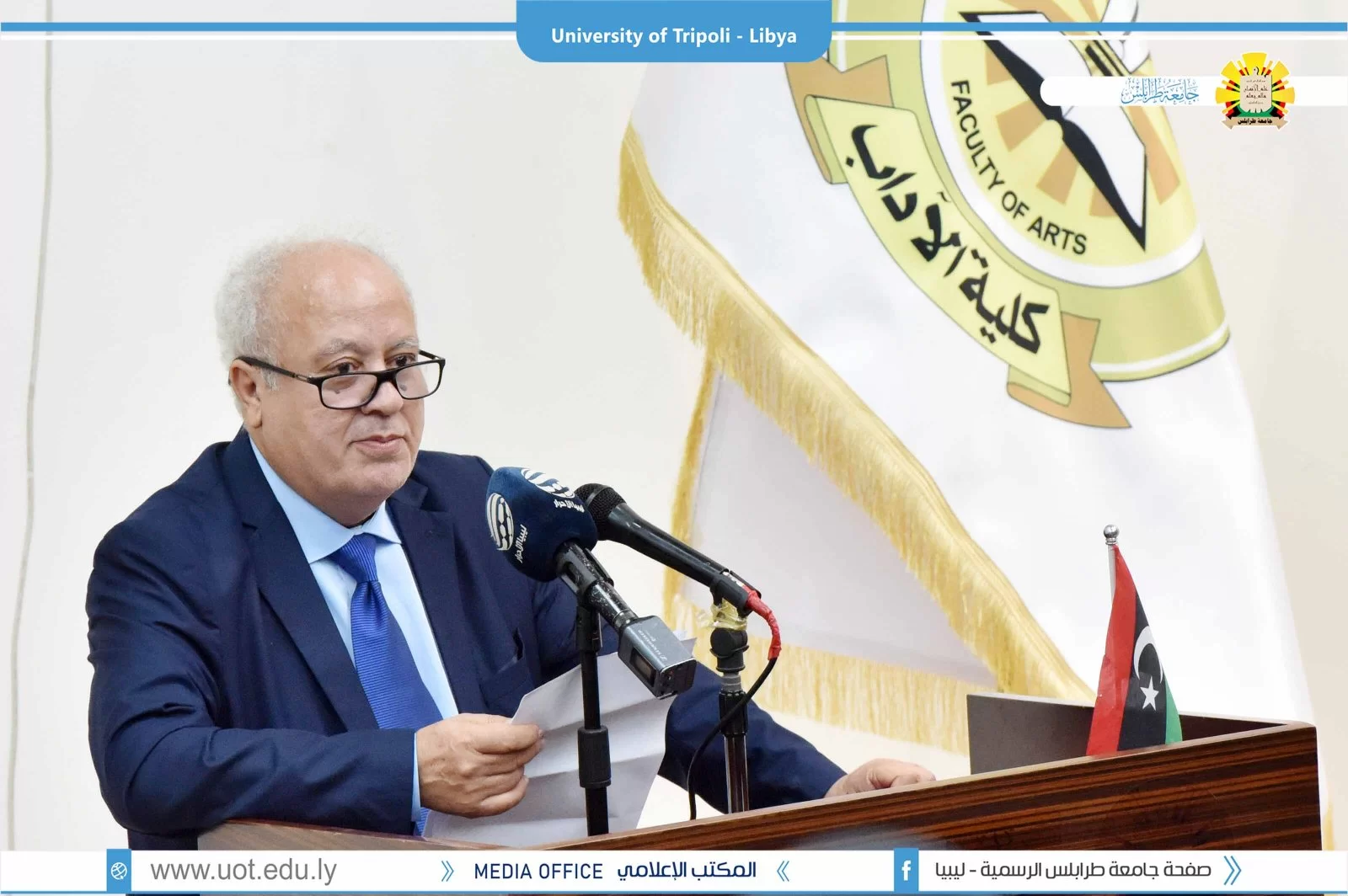 تم صباح اليوم الثلاثاء الموافق 27 سبتمبر 2022م بمبنى الكيمياء افتتاح مؤتمر التحديات و للمشاكل التي تواجه اللغة العربية تعلماً و تعليماً تحت عنوان "لغة القران بين الإقبال و الهجران" بحضور السيد أ.د. عمران القيب وزير التعليم العالي والبحث العلمي والسيد أ.د. خالد عون رئيس جامعة طرابلس والسيد د. خالد غومة وكيل الجامعة للشؤون العلمية والسيد أ. عبدالله الترهوني مدير المكتب الإعلامي بالجامعة و عميد كلية الآداب د. عبد الله مليطان والسيد عميد كلية العلوم الشرعية تاجوراء رفقة عدد من السادة عمداء الكليات ومدراء الإدارات بالجامعة. تم قص شريط افتتاح فقرات المؤتمر بخير ما يُفّْتَتح به تلاوة عطرة لآيات الذكر الحكيم بصوت القارئ أحمد أبو رقيقة تليها وقفة إجلال للنشيد الوطني منتقلين بعد ذلك لكلمات الحضور كلاً من السيد أ.د. خالد عون رئيس الجامعة و كلمة السيد أ.د. عمران القيب وزير التعليم العالي و البحث العلمي و بعض من شخصيات الحضور اختتاماً بكلمة الرئيس الشرفي للمؤتمر د. عبد اللطيف الشويرف، كما تم افتتاح معرض منوع لخطوط المصحف الشريف من ضمن البرنامج التنظيمي للمؤتمر. و ننوه على أن المؤتمر سيستمر لمدة يومين متتاليين مشبعين بفائدة عظيمة، حيث سيتم تقسيم اليومين إلى عدة فقرات تشمل جلسات علمية و حلقات نقاش، و في الآخر تسليم شهادات المشاركة. و بذلك نتقدم بالشكر و العرفان للقائمين على إنجاح المؤتمر بالشكل المطلوب.