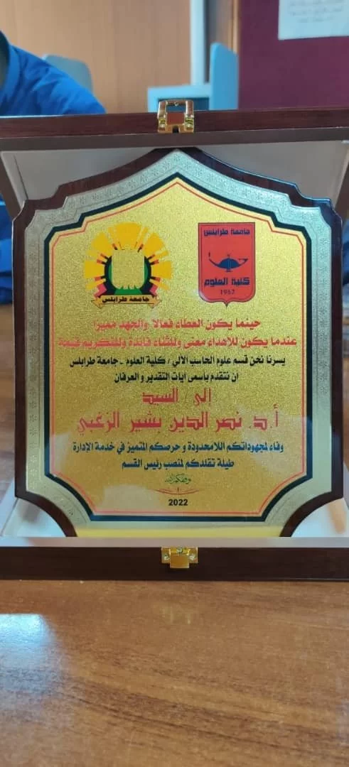 تم صباح اليوم الأربعاء الموافق 12 أكتوبر 2022م تكريم السيد أ.د. نصر الدين الزغبي بقسم الحاسب الآلي - كلية العلوم وذلك لجهوده المبذولة وخدماته الكبيرة التي قدمها لقسم الحاسب الآلي طيلة فترة توليه رئاسة القسم. وكما كان هذا التكريم بحضور كلاً من السيد أ.د. رمضان الجدي عميد كلية العلوم ولفيف من أعضاء هيئة التدريس والكادر الوظيفي بالقسم واستضافة السيد أ.د. فرج جمعة المزوغي مدير مكتب أعضاء هيئة التدريس بالكلية والسيد أ.د. محمد سالم الفيتوري، حيث تم تقديم درع الوفاء للسيد أ.د. نصر الدين عرفاناً من أسرة القسم على مجهوداته.