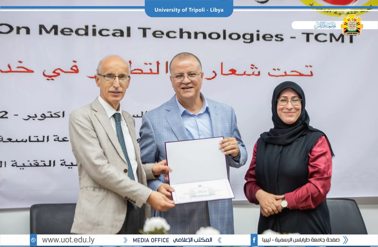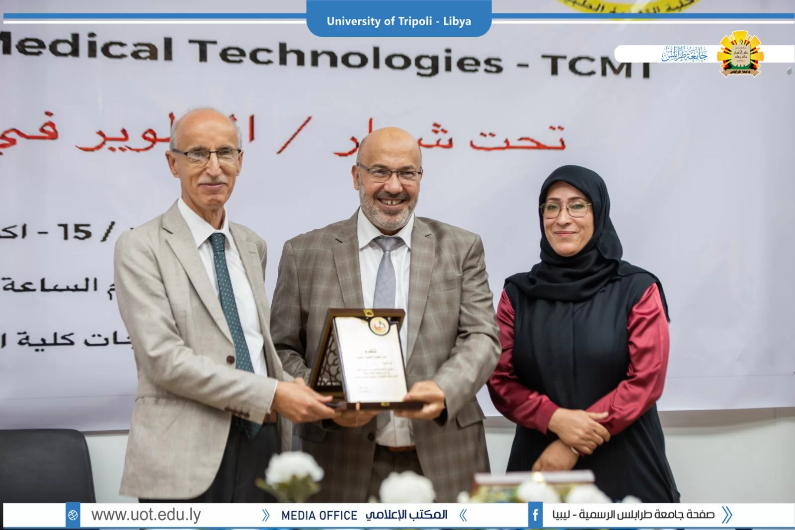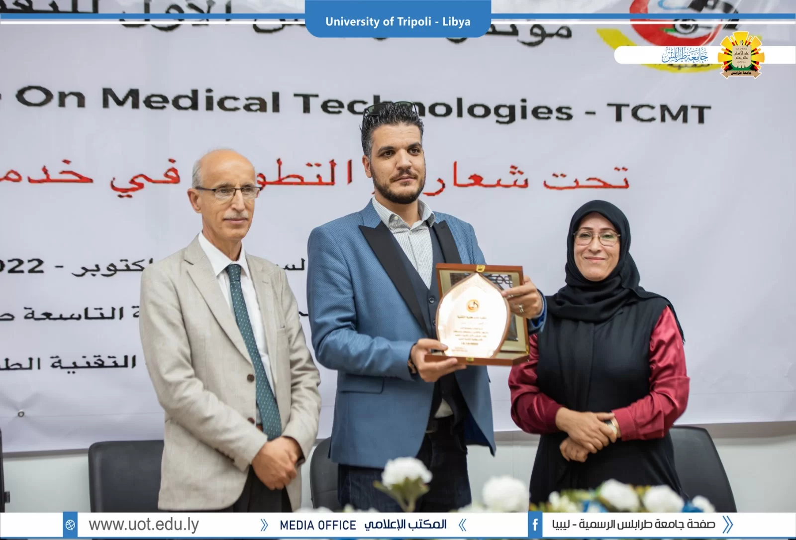 بتنظيم من كلية التقنية الطبية بجامعة طرابلس أقيم صباح اليوم السبت الموافق 15 أكتوبر 2022م على تمام الساعة التاسعة صباحاً مؤتمر طرابلس الأول للتقنيات الطبية بكلية التقنية تحت شعار: "التطوير في خدمات التقنية الطبية" بحضور السيد أ.د. خالد عون رئيس جامعة طرابلس رفقة السيد أ.د. صلاح الباروني وكيل الجامعة للكليات الطبية والسيدة أ.د. عائشة أحمد الشارف عميد كلية التقنية الطبية والسيد أ. محمود المصراتي، حيث شملت فعاليات المؤتمر محاضرات علمية لدكاترة الكلية ومناقشة مشاركات علمية من الطلبة. وفي الختام تم تكريم الأساتذة الذين قدمو الاستفادة العامة من خلال مشاركتهم في المؤتمر. كل الشكر والتقديم للقائمين على إنجاح المؤتمر بالمستوى المنشود.