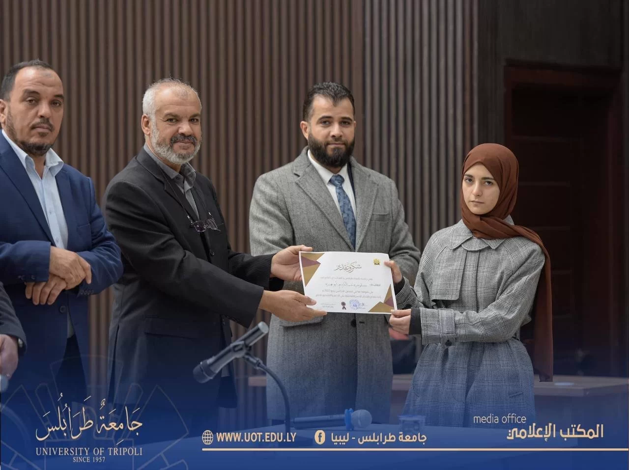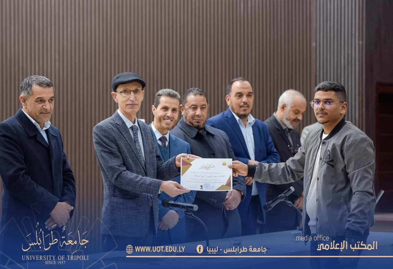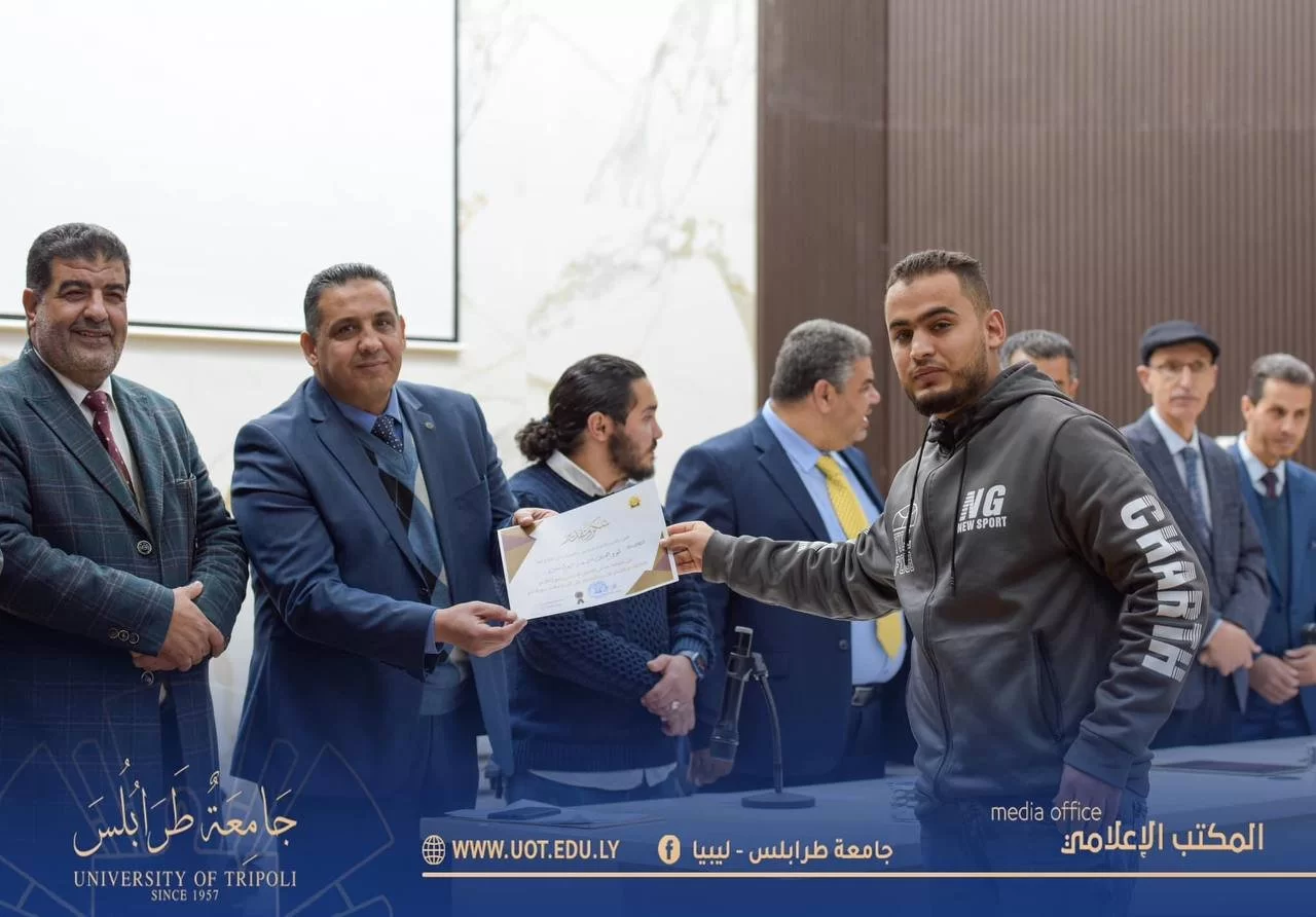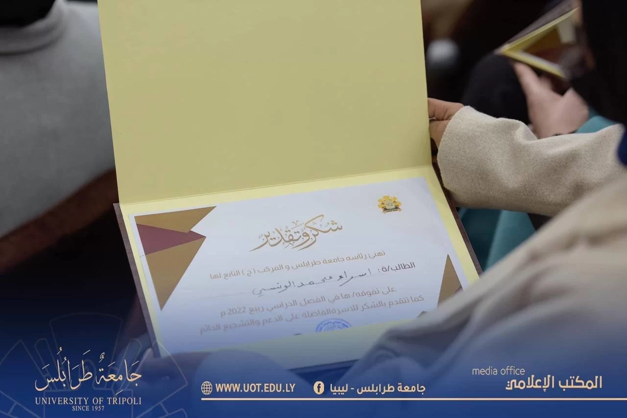 أُقيمت صباح اليوم الأحد الموافق 8 يناير 2023 م احتفالية تكريم الطلبة المتفوقين بكليات القاطع " ج " للفصل الدراسي " ربيع 2022 م " وعرض مشروع إعادة تأهيل مخطط عام المركب " ج " تاجوراء وذلك على تمام الساعة 11:00 صباحاً بمدرج رشيد كعبار بحضور السيد رئيس جامعة طرابلس رفقة السيد وكيل وزارة الزراعة والسيد وكيل الجامعة للشؤون العلمية والسيد وكيل الجامعة للقاطع " ج " والسيد وكيل الجامعة للشؤون الطلابية والسيد وكيل العلوم الطبية والسيد المسجل العام والسيد عميد كلية الاقتصاد والعلوم السياسية والسيد عميد كلية تقنية المعلومات والسيد وكيل كلية تقنية المعلومات والسيد منسق كلية القانون تاجوراء والسادة أعضاء المجلس البلدي تاجوراء ولفيف من أعضاء هيئة التدريس والطلبة وذويهم، حيث تم تكريمهم وتسليم شهائد تفوقهم من رئاسة الجامعة إضافةً لبعض الجوائز التحفيزية وذلك من منطلق دعم جامعة طرابلس الدائم لأبنائها المتميزين والدفع بهم للمضي قدماً نحو الأمام والتفوق .