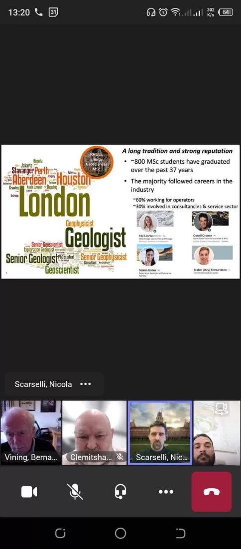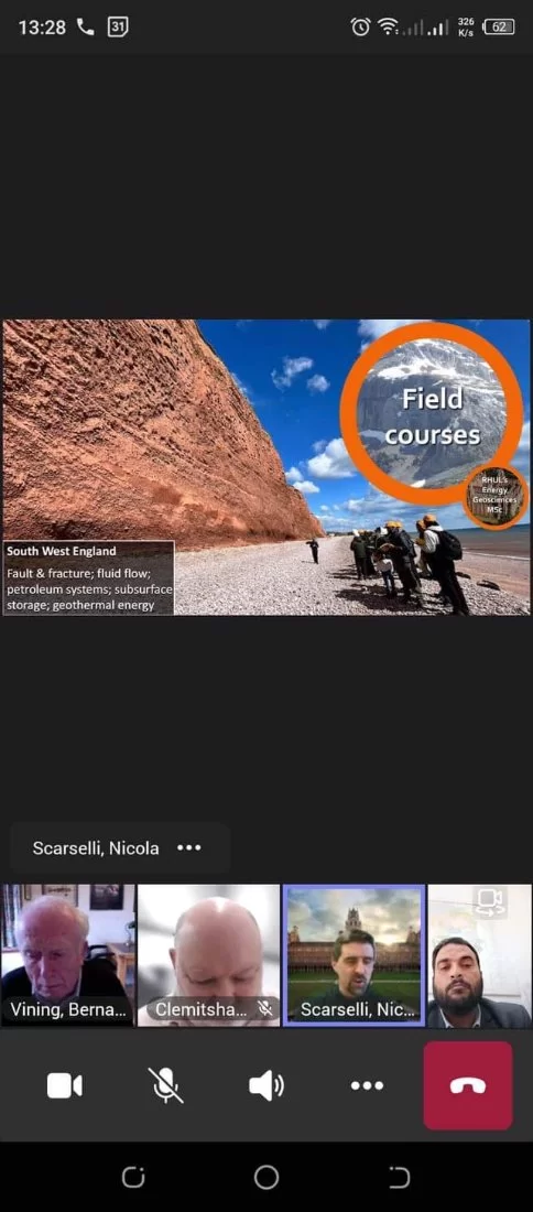 بدعوة كريمة من السيد بروفسور كلميتشو K.Clemitshaw رئيس قسم علوم الأرض في جامعة رويال هولواي ببريطانيا ، حيث شارك السيد أ.د. أسامة أحمد هلال رئيس قسم الجيولوجيا في اجتماع Microsoft Teams رفقة كل من د. عوض بلال رئيس قسم علوم الأرض بجامعة بنغازي والسيد أ. يوسف بوطرومة من الجمعية الليبية لعلوم الأرض، حيث تم مناقشة مواضيع عدّة ذات أهمية وصلة بمحور الموضوع أبرزها المهارات التي يتوجب تواجدها عند موظفي علوم الأرض حسب المنطقة الجغرافية والحواجز المتوقع تواجدها أمام من ينجزون درجة الماجستير في مجال الطاقة من علوم الأرض وتسليط الضوء على قضايا متوقع حدوثها.