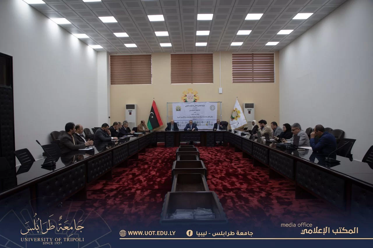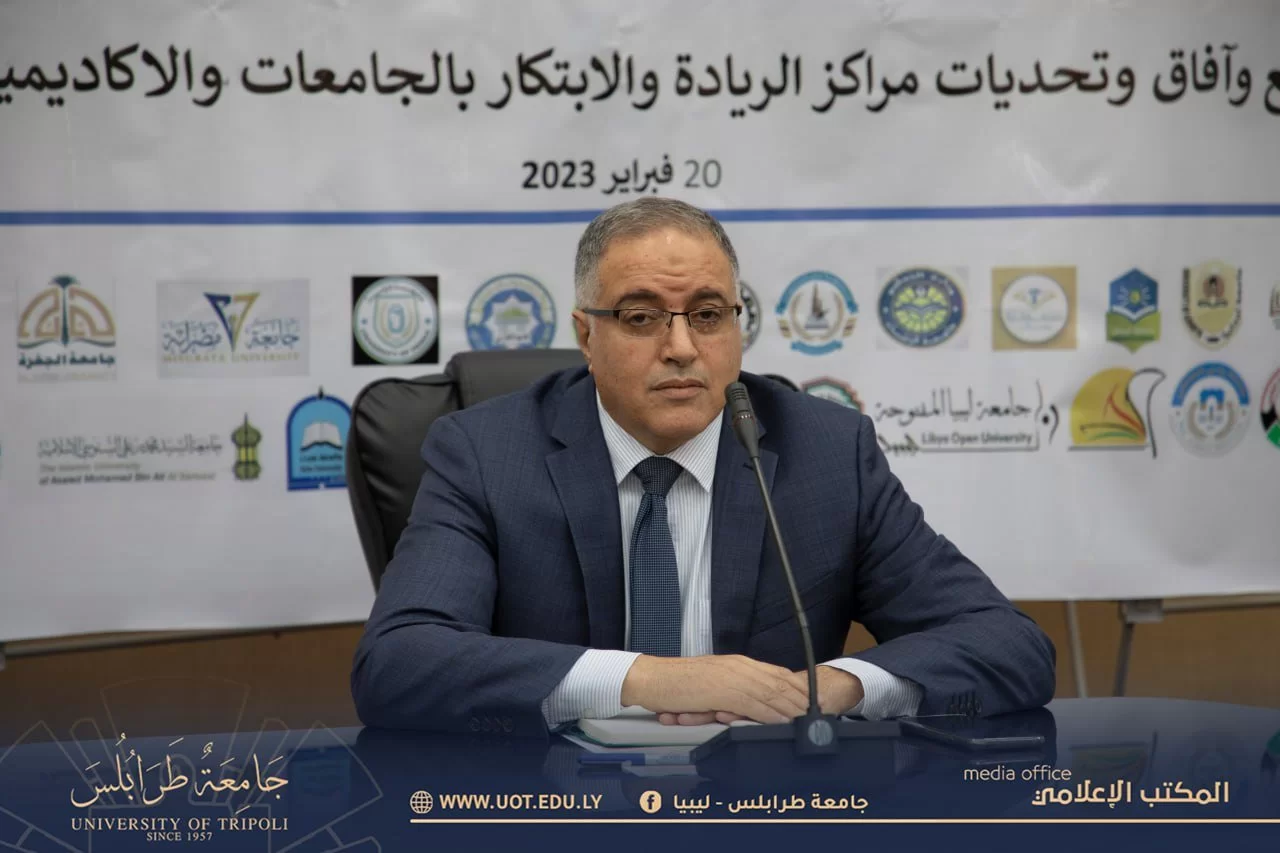 بتنظيم وزارة التعليم العالي والبحث العلمي وقد افتتح أعمال الورشة السيد د. صالح الغول وكيل وزارة التعليم العالي والبحث العلمي والسيد أ.د. خالد عون رئيس جامعة طرابلس، حيث استهل السيد د. مصباح الطالبي الورشة بكلمة ترحيبية بالسادة مدراء المراكز ومن ثم تم الانتقال إلى مناقشة محاور الورشة، والتي أهمها دور وأهمية مراكز الريادة والابتكار بالجامعات الليبية واستراتيجيات استقطاب الرواد وسبل تطوير الأفكار وتحويلها إلى مشاريع ناجحة ذات قيمة، وكذلك تم التطرق إلى أهمية التشبيك مع أصحاب المصلحة ودوره في تذليل العقبات وآليات اعتماد مقرر الريادة والابتكار بالجامعات والأكاديمية الليبية.