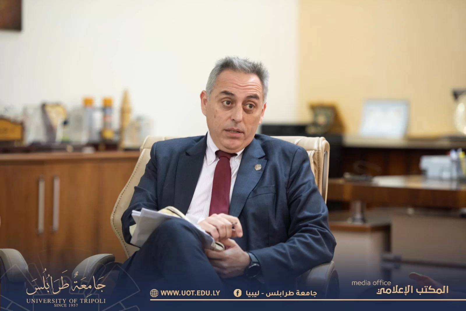 سفير إسبانيا السيد خافيير اولالكياغيا يزور رئاسة جامعة طرابلس رفقة السيد خرمينال فراسيا مدير معهد ثيربانتس بتونس والسيدة قنصل إسبانيا بليبيا، وقد حضر اللقاء عميد كلية اللغات ورئيس قسم اللغة الإسبانية بجامعة طرابلس والملحق الثقافي الليبي بالسفارة الليبية بمدريد، وقد تناول اللقاء أوجه التعاون المختلفة بين الجامعات الإسبانية وجامعة طرابلس، إضافة إلى إمكانية فتح فرع لمعهد ثيربانتس بجامعة طرابلس، وتنفيذ برنامج لتدريب أعضاء هيئة التدريس وامتحان طلاب اللغة الإسبانية في ليبيا في شهادات الكفاءة التي يصدرها المعهد، وقد تم الاتفاق على تكثيف الاتصال بين الطرفين للوصول إلى اتفاقية وبرنامج تعاون مثمر.