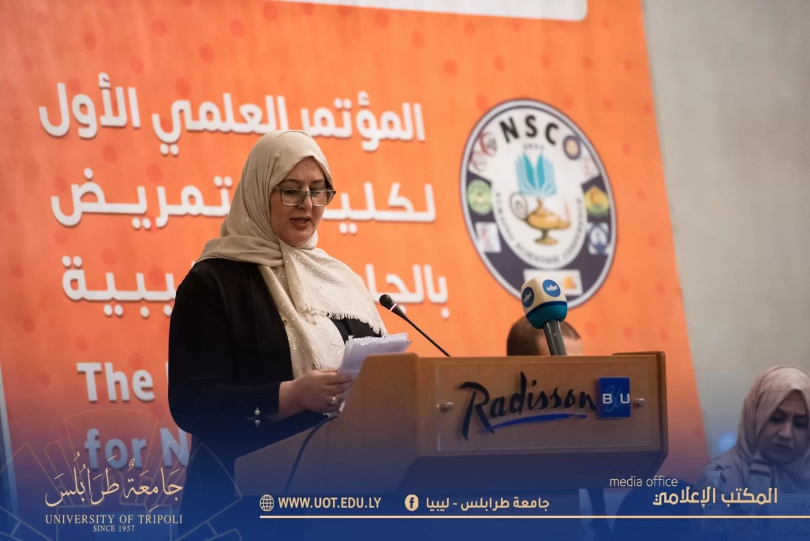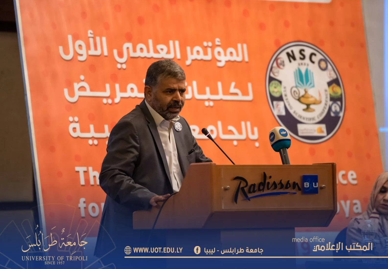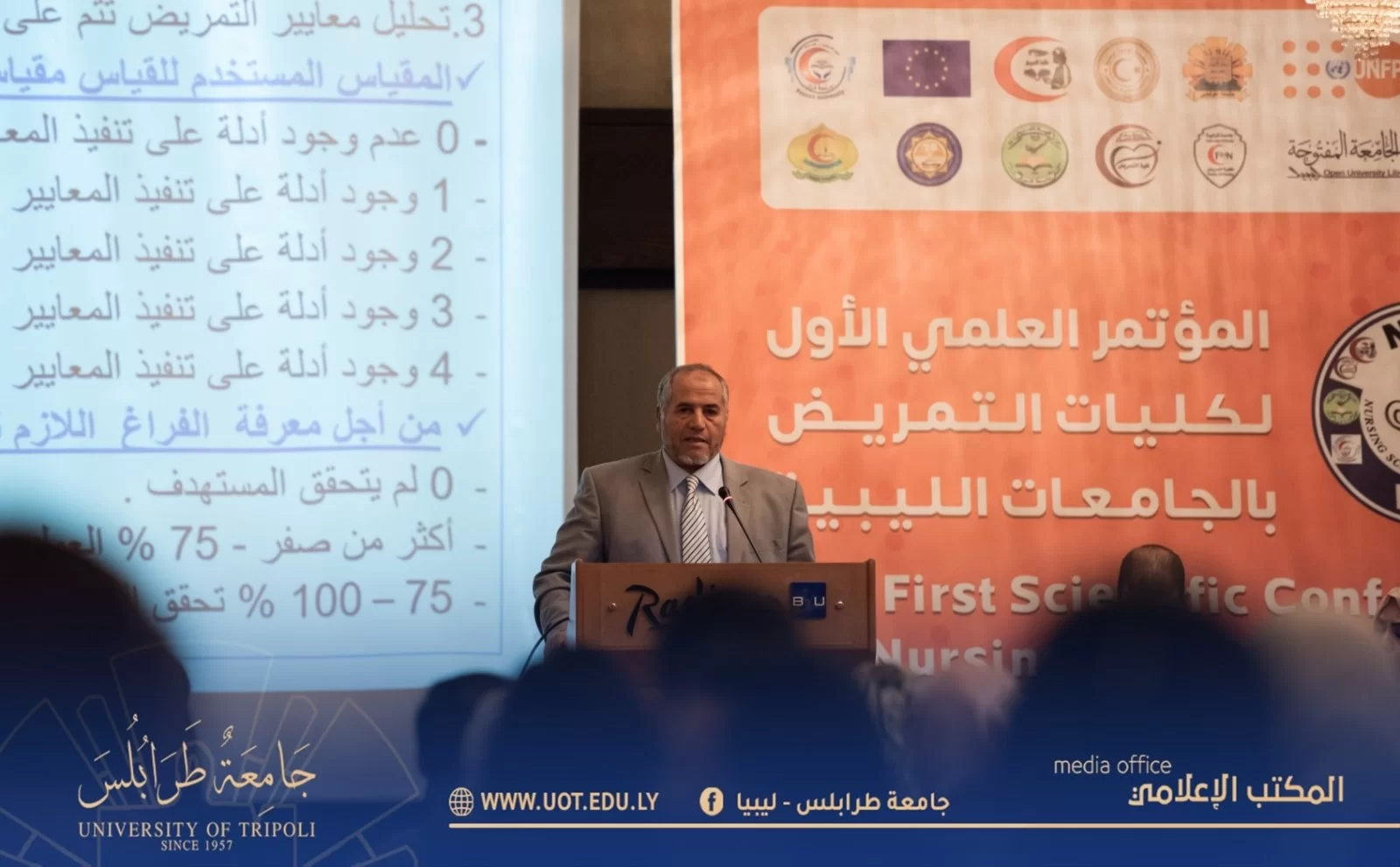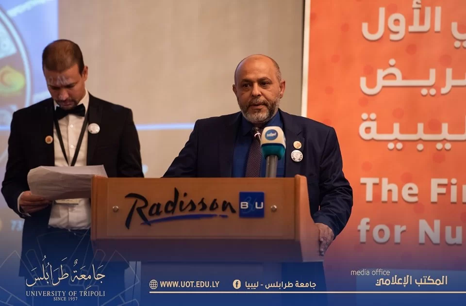 أُفتتح صباح اليوم السبت الموافق 19 نوڤمبر 2022م بفندق المهاري على تمام الساعة العاشرة صباحاً المؤتمر العلمي الأول لكليات التمريض بالجامعات الليبية وذلك بتنظيم كلية التمريض - جامعة طرابلس بحضور السيد د. خالد غومة رئيس جامعة طرابلس المكلف رفقة السيد أ.د. أمجد شختور وكيل الجامعة للكليات الطبية وعميد كلية التمريض والسيد وكيل الجامعة للقاطع ج و عدد من السادة عمداء الكليات الطبية بالجامعة وممثل عن لجنة الصحة بمجلس النواب وممثلي وزارتي الصحة والتعليم العالي والبحث العلمي بالإضافة إلى الجهات الداعمة والمشاركة بالمؤتمر ومسؤولي كليات التمريض بالجامعات الليبية والمهتمين بالمجال.حيث استهل البرنامج الزمني للمؤتمر بآيات بينات من الذكر الحكيم تليها النشيد الوطني، انتقالاً إلى عرض مرئي شامل عن كليات التمريض بالجامعات الليبية، ومن ثم تم الابتداء ببرتوكول الكلمات حسب التسلسل السليم المتعارف عليه ابتداءً من كلمة رئيس المؤتمر واللجنة التحضيرية له، مروراً بكلمة رئيس اللجنة العلمية وكلمة رئيس جامعة طرابلس المكلف وكلمات المؤسسات المعنية والمُشاركة منها (وزارة التعليم العالي والبحث العلمي ووزارة الصحة ولجنة الصحة بمجلس النواب واللجنة العليا للكليات الطبية والطبية المساعدة وأيضاً صندوق الأمم المتحدة للسكان/ ليبيا ومدير مكتب الدراسات العُليا بكلية التمريض - جامعة طرابلس ومصحتي الخليل والمسرة وأخيراً كلمة اتحاد الطلبة.وبعد الفصل باستراحة زمنية بسيطة تم الانطلاق بالمسيرة العلمية والعملية للمؤتمر، حيث قُص شريط الافتتاح الافتراضي للجلسة الحوارية الأولى ليوم السبت التي شملت في طياتها خمسة محاضرات علمية غطت كافة المحاور المهمة لمجال التمريض ودارسيه، حيث أن المحاضرة الأولى كانت مُسلطة الضوء على جودة التمريض في كليات التمريض بليبيا ومن ثم سلطت الضوء على أخلاق المهنة وسلامة المريض وكذلك ضمان جودة مخرجات البرامج التعليمية لكليات التمريض وأيضاً المعايير المهنية للممارسة والسلوك للممرضات والقابلات وأخيراً التحديات التي تواجه المريض في ليبيا.