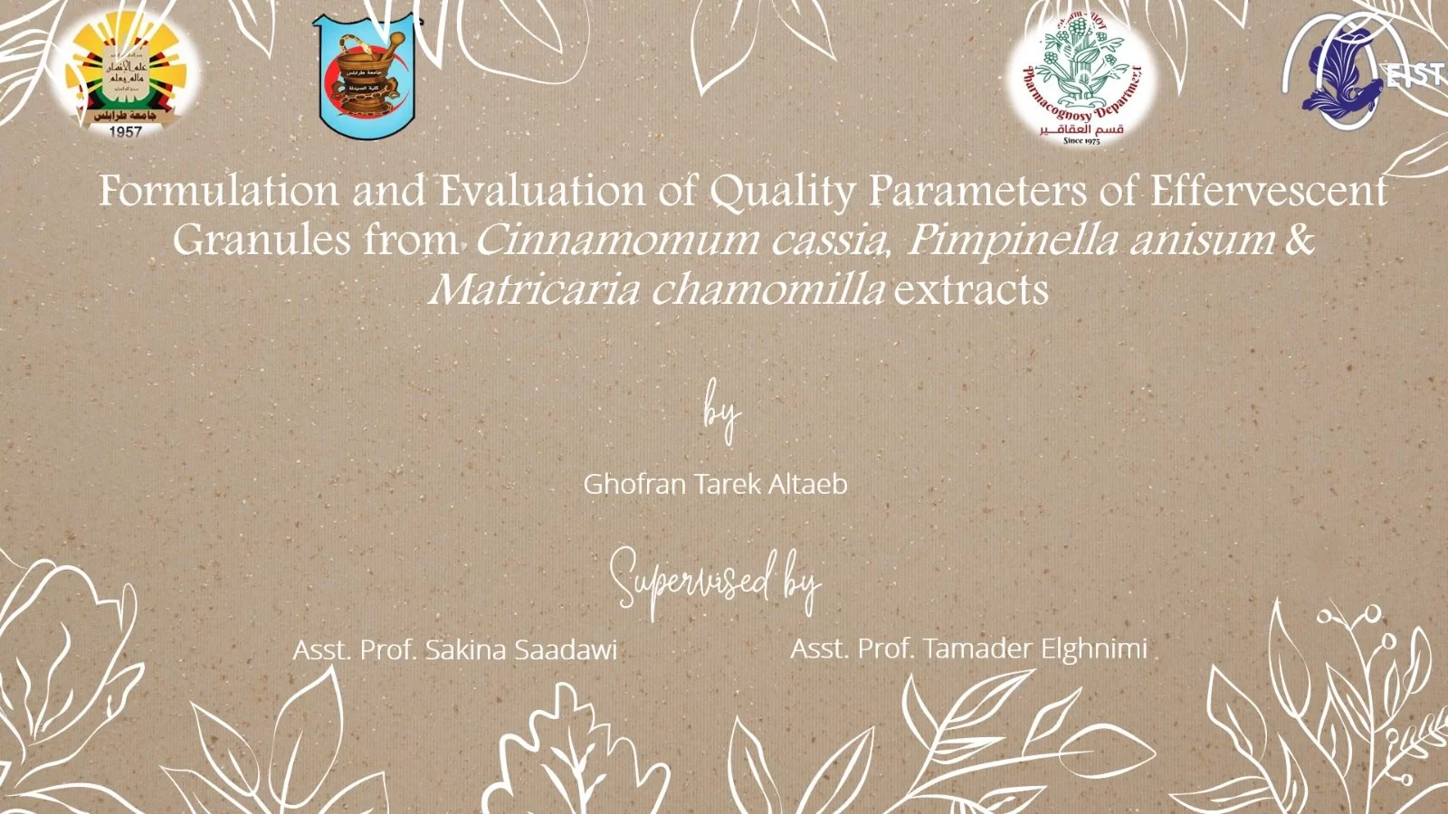 تم بفضل الله اليوم السبت الموافق 20/7/2024 مناقشة مشروع التخرج للصيدلانية:غفران طارق التائبتحت عنوان: