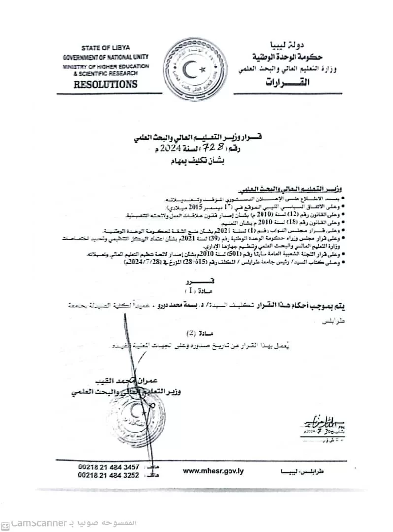 الدكتورة بسمة دورو توليها منصب عميد كلية الصيدلة جامعة طرابلس لأول مرة، وبعد 50 عاما لتكون أول امرأة وأصغر عميد لكلية الصيدلة بجامعة طرابلس.