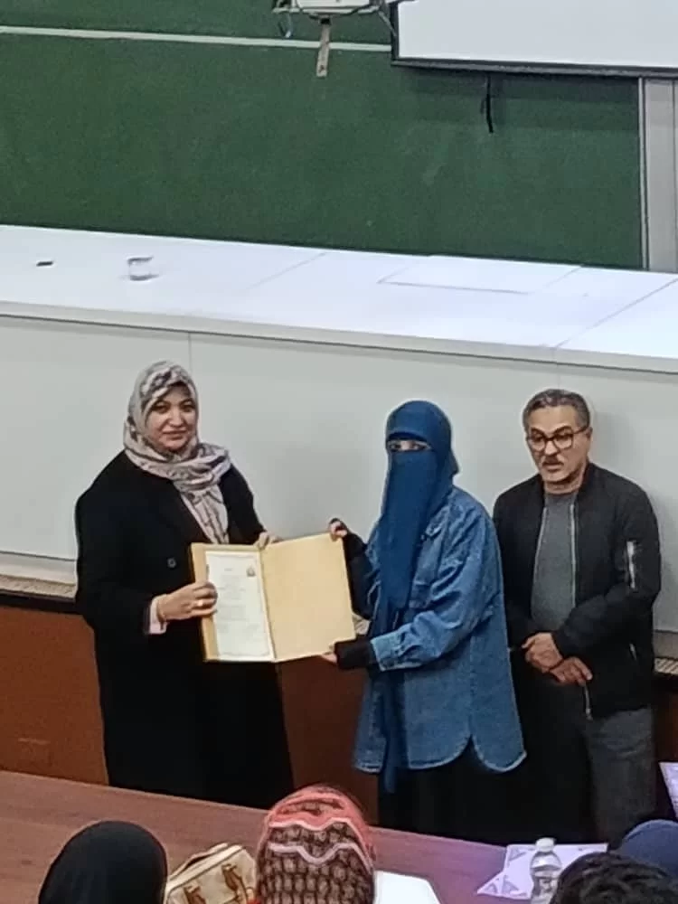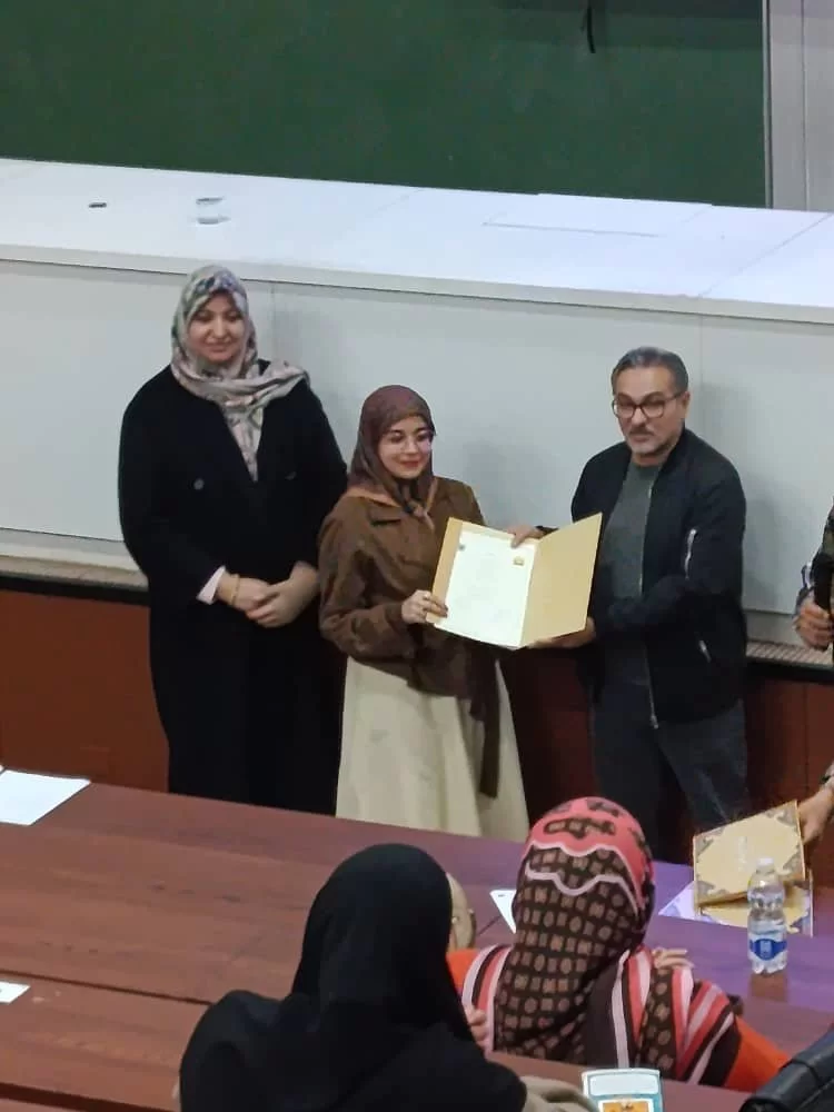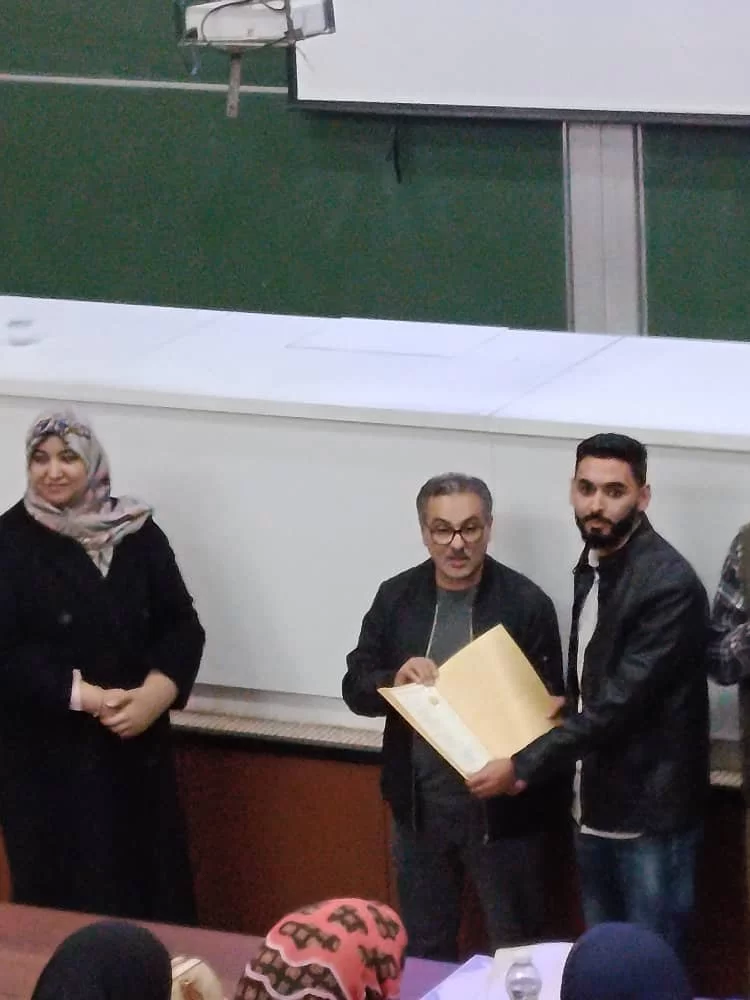 تكريم الطلبة المشاركين في اليوم العلمي لمشاريع التخرج لفصل خريف 2025، وذلك تقديرًا لجهودهم العلمية ومشاركاتهم المتميزة. كما شمل التكريم اللجنة المقيمة لمشاريع التخرج، بحضور الأستاذ الدكتور عميد كلية الصيدلة، والسيد الأستاذ الدكتور جمعة سليمان عميد كلية التقنية الطبية، إلى جانب السيد رئيس لجنة اليوم العلمي الأستاذ الدكتور عبدالفتاح قاباج.