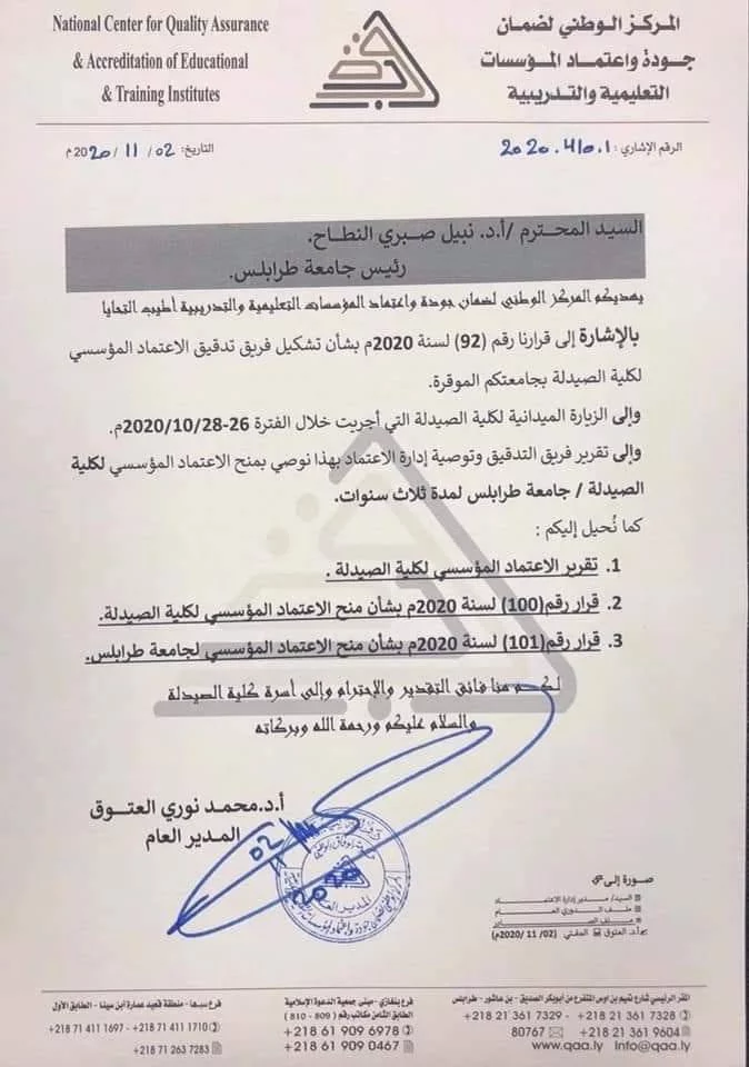 استقبل رئيس جامعة طرابلس "أ.د.نبيل النطاح" صباح اليوم الثلاثاء الموافق للثالث من نوفمبر كلاً من عميد كلية الصيدلة "أ.د.عبد الرؤوف القصبى" و رئيسة قسم الجودة وتقييم الأداء بكلية الصيدلة "د.آمال عمار"، حيث سلّم السيد الرئيس لهم قرار الإعتماد المؤسسى لكلية الصيدلة والذى يحمل قرار رقم "100" لسنة 2020 والصادر من مدير المركز الوطنى لضمان الجودة واعتماد المؤسسات التعليمية والتدريبية "أ.د.محمد العتوق" الذي يشمل اعتماد برنامج البكالوريوس للعلوم الصيدلانية والماجستير في بعض الأقسام المشار إليها في القرار. وباعتماد كلية الصيدلة بجامعة طرابلس، تم اعتماد اسم جامعة طرابلس بقرار رقم "101" لسنة 2020 الصادر أيضاً من مدير المركز الوطني لضمان الجودة واعتماد المؤسسات التعليمية والتدريبية "أ.د.محمد العتوق"، وفي الوقت نفسه قدّم السيد عميد الكلية والسيدة رئيسة قسم الجودة وتقييم الأداء الشكر والتقدير والعرفان للسيد رئيس جامعة طرابلس "أ.د.نبيل النطاح" علي دعمه وتشجعيه من أجل إرساء وتطبيق معايير الجودة بجامعة طرابلس، أيضاً تم تقديم الشكر والتقدير إلى فريق التدقيق المكلف من المركز الوطني لضمان الجودة واعتماد المؤسسات التعليمية والتدريبية وعلي رأسهم السيد مدير المركز وكل أعضاء مجلس الكلية والموظفين بكلية الصيدلة على كافة جهوذهم المبذولة، مُتمنين كل التوفيق لكافة الكليات وكل المهتمين بالجودة بها، من أجل أن تكون جامعة طرابلس في صفوف الجامعات المرموقة.