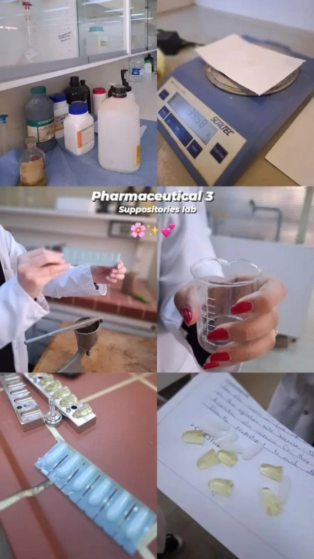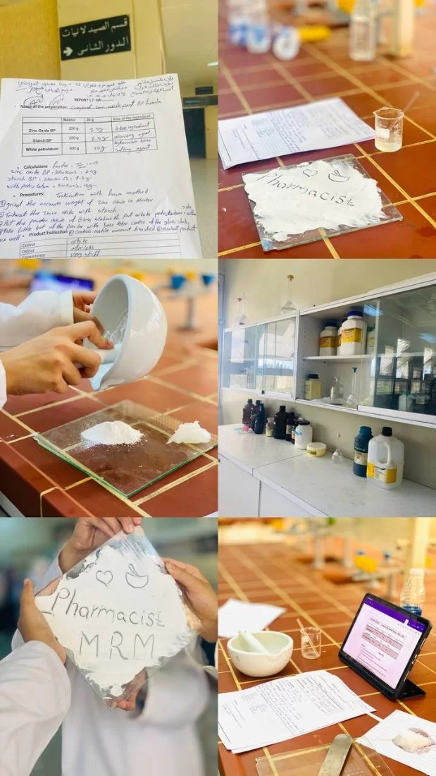 قام الطلبة بعدة تركيبات تشمل التحاميل والمعاجين وغيرها وقد اشاد الطلاب بطريقة اعطاء المعامل التفاعلية والتي تعتمد على نظام فريق العمل وكيفية تعلمهم للتركيب الصيدلاني لانتاج الاشكال الدوائية المختلفة