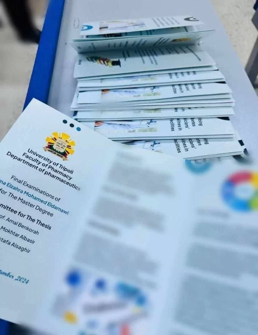 ناقشت الطالبة فاطمة الزهراء محمد الدرناوي رسالة الماجستير الخاص بها بقسم الصيدلانيات تحت إشراف ا.د آمال يوسف بن كورة