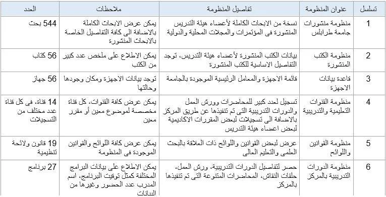 السلام عليكم ورحمة الله وبركاتهمن أحد أهم البرامج التى يعمل المركز على تنفيذها وتفعيلها هى منصة قاعدة بيانات جامعة طرابلس وذلك نظرا لأهمية وجود قاعدة البيانات بالنسبة للمركز ولكافة منتسبي الجامعة.تحتوى قاعدة البيانات على عدد كبير من المنظومات المختلفة التى يمكنها ان تساعد الجميع (مت
