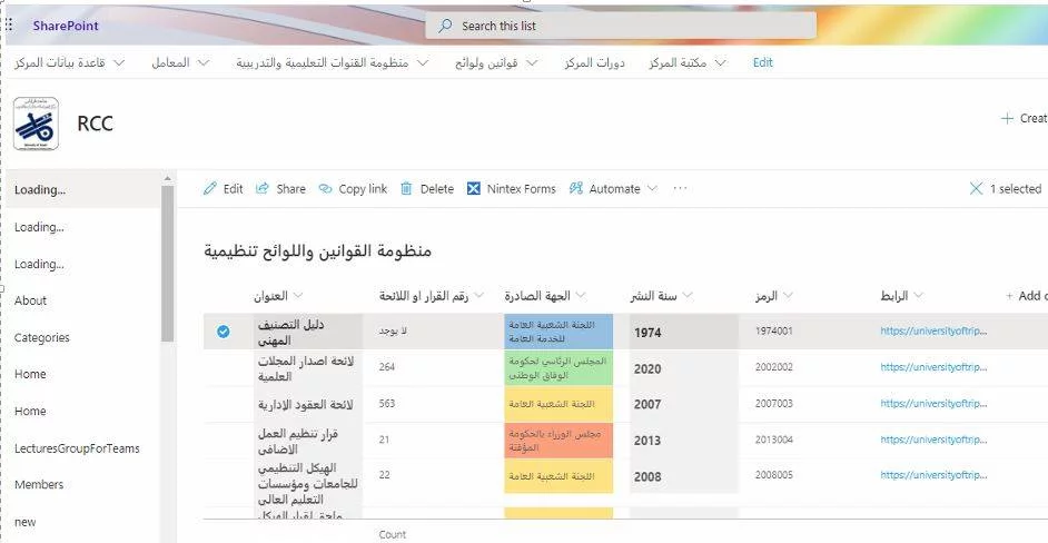 السلام عليكم ورحمة الله وبركاته تم إضافة وتفعيل المنظومات التالية داخل قاعدة بيانات جامعة طرابلس:1. منظومة القوانين واللوائح منظومة الكترونية تحوى نسخة الكترونية من القوانين واللوائح التنظيمية المهمة فى مجال التعليم العالي والبحث العلمي أو ذات العلاقة بعمل الجامعات.2. منظومة