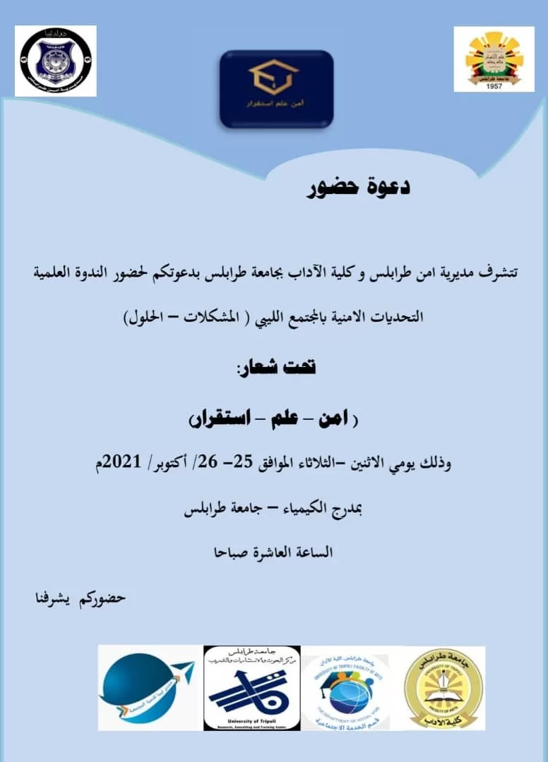 دعوة لكافة المهتمين لحضور ندوة علمية تحت عنوان "التحديات الامنية بالمجتمع الليبي (المشكلات والحلول)المكان: مدرج قسم الكيمياء - جامعة طرابلساليوم: يمى الاثنين والثلاثاء الموافق 25 - 26 اكتوبر 2021التوقيت: الساعة العاشرة