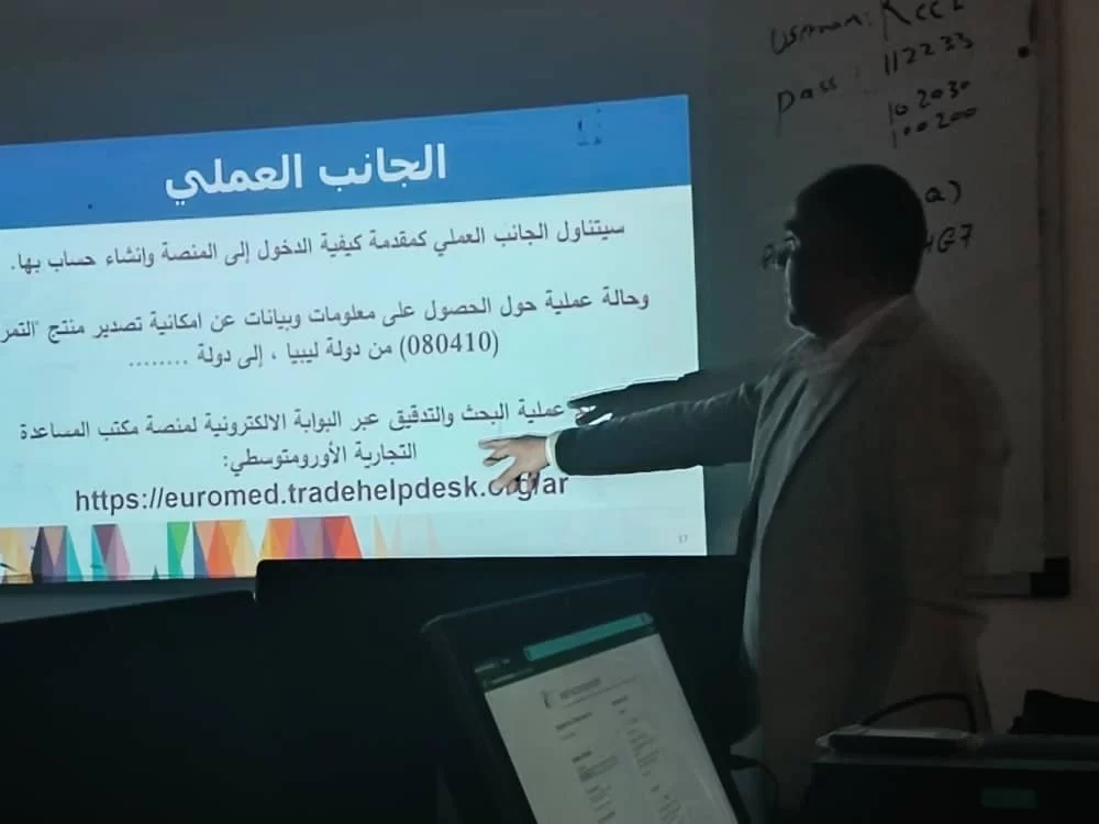 أقيم صباح اليوم الأربعاء 30 نوفمبر 2022 الموافق 6 جمادى الأول 1444 هـ ، يمركز البحوث والاستشارات والتدريب بجامعة طرابلس ورشة عمل حول: استخدام المنصة الالكترونية لمكتب مساعدة التجارة الأورومتوسطية Euromed Trade Helpdesk ، نظمها أ. وليد رمضان سالم، عضو هيئة التدريس بكلية الاقتصاد والعلوم السياسية، وحضرها مجموعة من أعضاء هيئة التدريس.