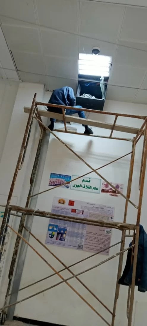في إطار التعاون بين إدارات الجامعة يساند موظفي كلية العلوم وفنيي الشؤون الفنية بالجامعة الشركة المكلفة بتركيب الكاميرات داخل مرافق كلية العلوم