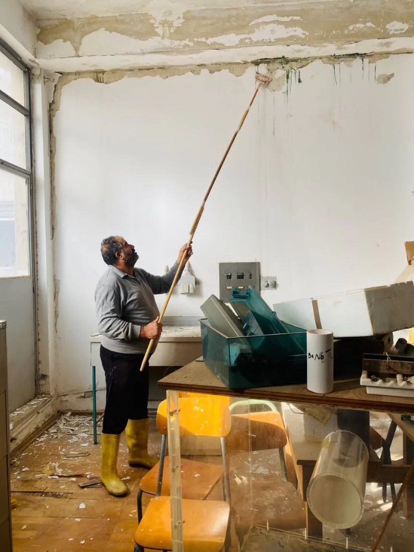 نرفع لكم القبعة استاذنا الكريم للمجهودات الراقية المبذولة لأجل تيسير العمل داخل معامل الكلية حيث انه اليوم الجمعة وخلال يوم العطلة الرسمية قام السيد/ بلعيد سعيد رئيس وحدة الشؤون الفنية والخدمات بالكلية بأعمال طلاء معمل الفيزياء نظراً لتهالك الجدران نتيجة تسرب مياه الأمطار والرطوب بالإضافة اعمال ا